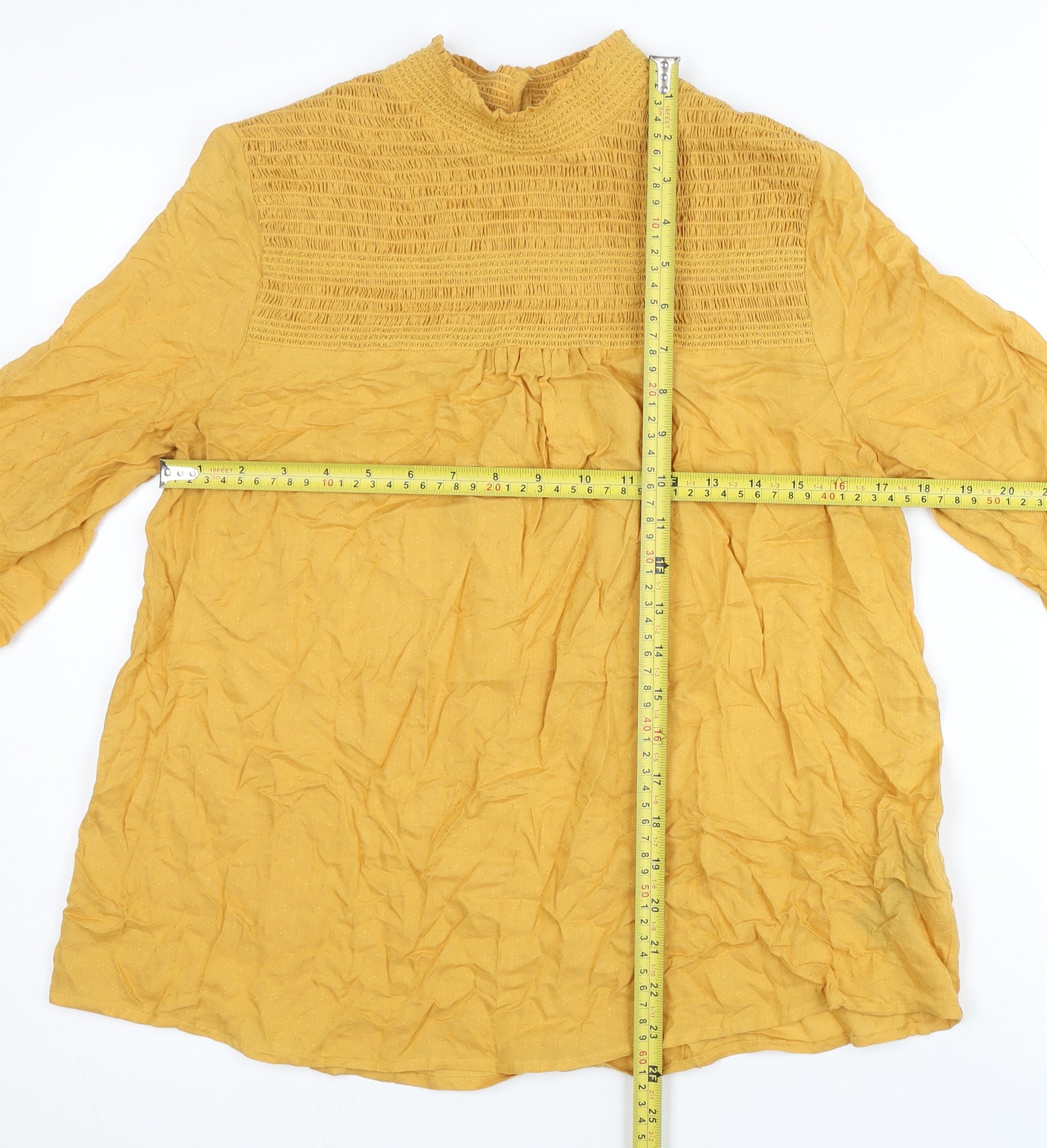 Elevate your wardrobe with this stylish yellow blouse from Next. Crafted from soft and breathable modal, this long sleeve blouse is perfect for both casual and semi-formal occasions. The high neckline adds a touch of elegance, while the solid yellow hue ensures it's versatile enough for any season. This blouse features button accents on the back, providing a chic and refined look. Although it's in excellent condition, it has a wrinkled appearance that can easily be addressed with a quick steam or iron. Pair it with your favourite trousers or a skirt for an effortless, fashionable ensemble. Ideal for women seeking comfort without compromising on style, this blouse is a must-have addition to any wardrobe. Don't miss the chance to own this beautiful blouse—grab it now and add a splash of colour to your outfit.