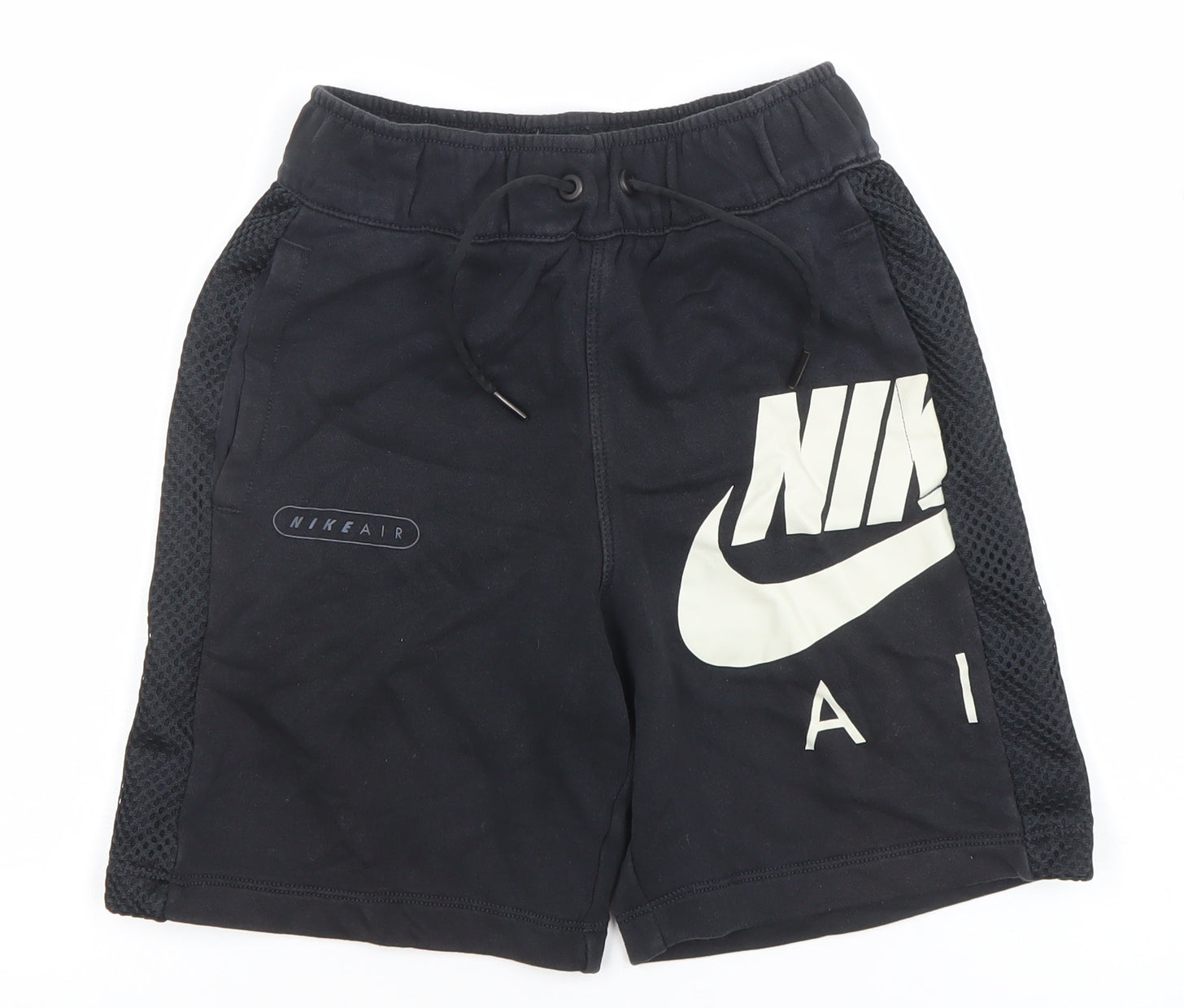 Keep your young athlete comfortable and stylish with these Nike boys’ black athletic shorts. Made from a quality jersey fabric blend of 60% cotton and 40% polyester, these shorts are lightweight, breathable, and designed for active play. With a regular fit and mid-rise waist, they offer both freedom of movement and a secure, comfortable feel during sports, training or casual wear. The elastic waistband with an adjustable drawstring ensures a personalised fit, while the side mesh panels enhance ventilation to keep them cool throughout the day. Featuring bold Nike Air branding across the leg, these shorts combine simple design with sporty flair, perfect for those who love the iconic brand style. Two convenient front pockets and one rear pocket provide practical storage options for daily essentials. Ideal for activities such as running, football, or gym training, these versatile shorts also double up as casual wear for holidays, school, or relaxing days at home. Their sleek black colour makes them easy to pair with any top or sportswear, making them a staple choice in any boy’s wardrobe. These Nike shorts are in excellent pre-owned condition with no noticeable signs of wear, though they do not come with original retail tags. Machine washable and quick drying, they’re easy to care for and built to last. Perfect for spring, summer, and autumn wear, they deliver both comfort and durability for energetic kids. Give them the confidence to move freely and look great whether they’re in training or relaxing. A brilliant choice for active boys who value comfort and classic Nike sports style.