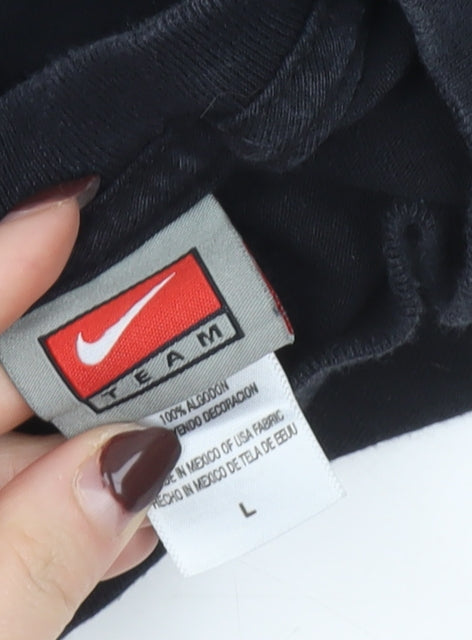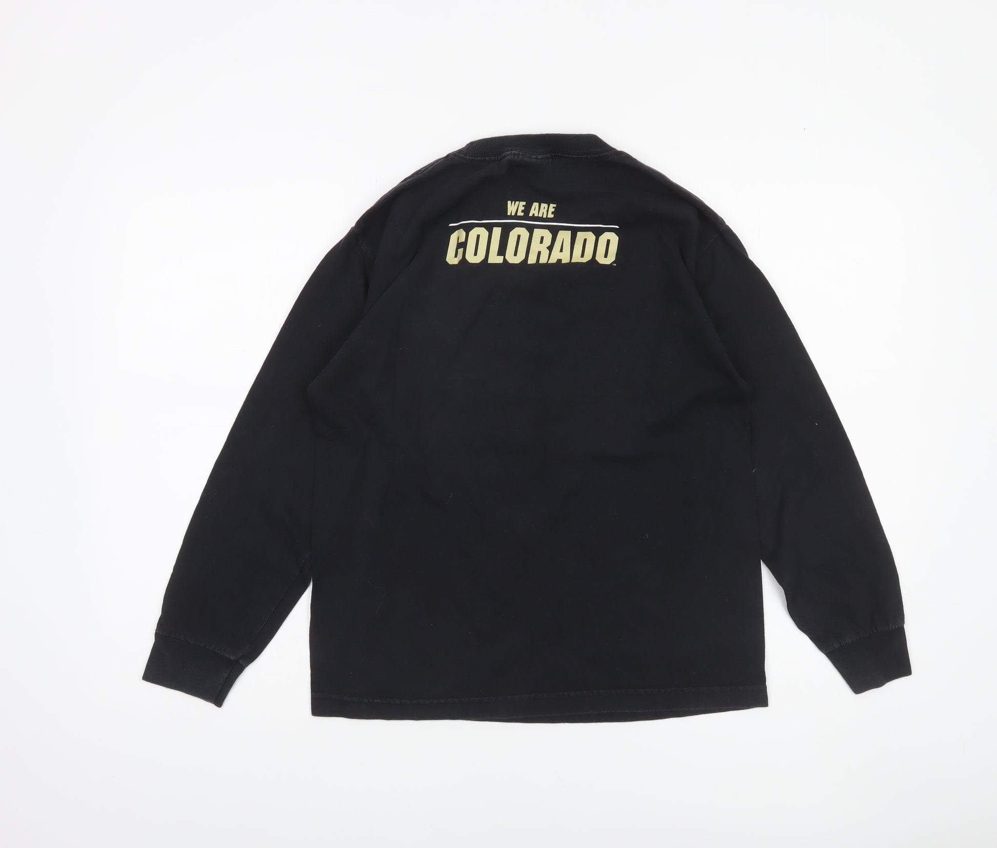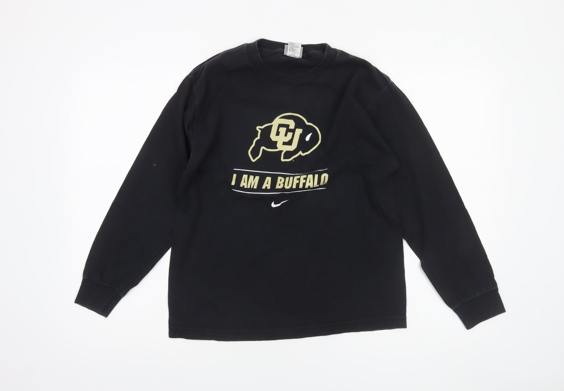Show your sporting pride with this Nike Boys Black Long Sleeve Graphic Pullover T-Shirt, made from soft and breathable 100% cotton for everyday comfort. Featuring the distinctive gold 'I Am A Buffalo' graphic on the front and 'We Are Colorado' on the back, this officially licensed Nike Team tee celebrates sporting heritage with a bold design that stands out both on and off the field. The classic crew neckline and ribbed cuffs provide a structured fit, while the regular cut ensures ease of movement for active kids. Perfect for casual wear, school events, or representing your team spirit at sports activities, this long sleeve tee pairs easily with jeans, joggers, or shorts for a versatile look. The durable fabric and breathable material make it ideal for spring, autumn, and winter layering. In very good pre-owned condition, this top shows minimal signs of previous use with no stains, rips, or tears, offering great quality and style at a fraction of the original price. Machine washable for easy care, the Nike Team design ensures lasting comfort and performance. A must-have for young fans of university or football culture who appreciate authentic sportswear with everyday wearability — grab this stylish and sporty piece today to add some iconic Nike energy to your wardrobe!