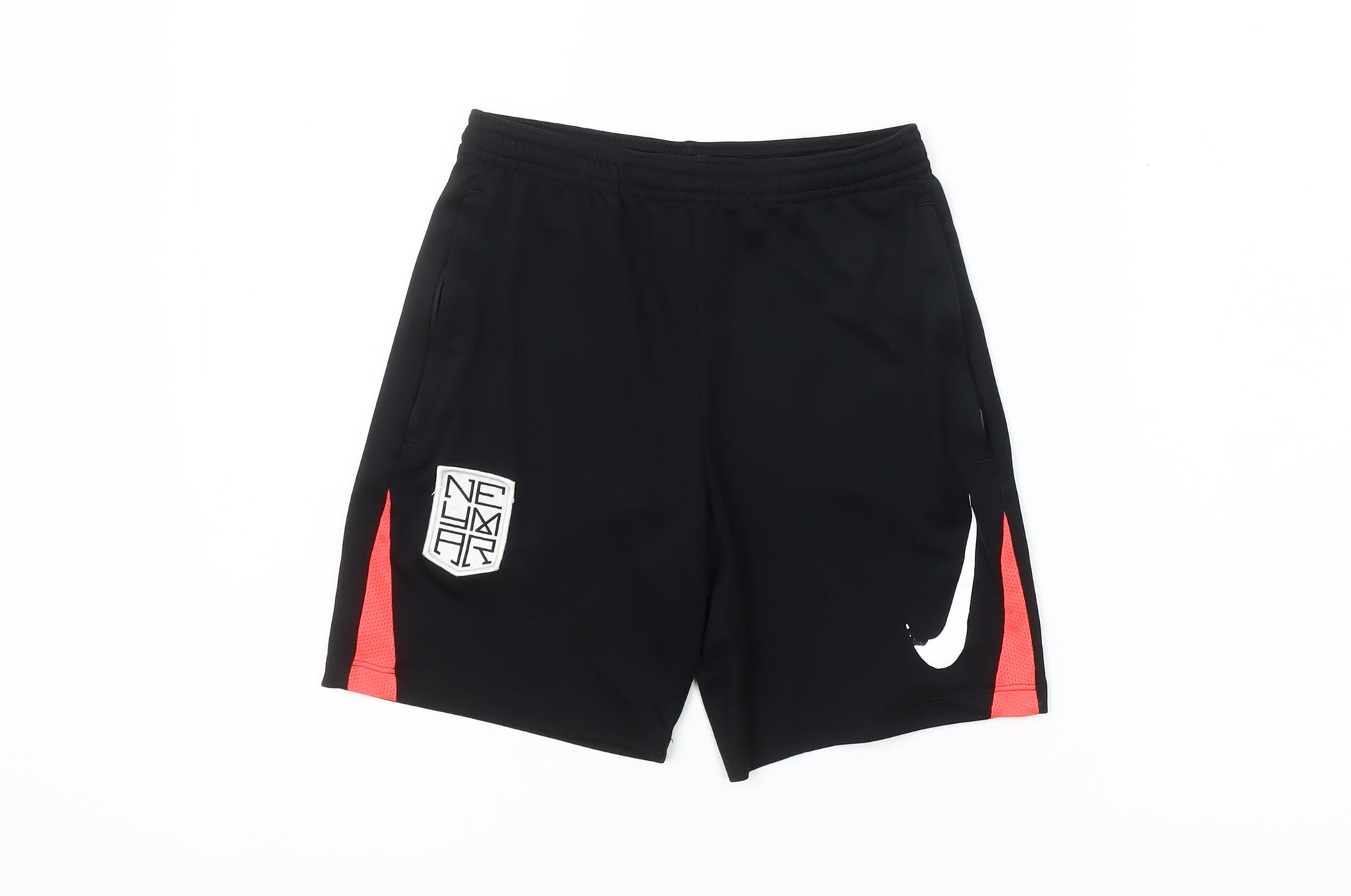 Enhance your child’s sporty wardrobe with these Nike Boys Black Neymar Athletic Shorts, designed for both comfort and performance. Perfect for football enthusiasts, these shorts feature Nike’s iconic swoosh logo alongside a Neymar crest for a touch of athletic flair. Crafted from a high-quality polyester and elastane blend, they offer a lightweight, breathable, and quick-drying fabric ideal for active days on the pitch, gym sessions, or casual wear. The elasticated waistband with an adjustable drawstring ensures a personalised, secure fit, allowing ease of movement during running, training, or general play. Each side is detailed with red mesh panels for added style and ventilation, while functional side pockets add practicality for storing essentials like keys or small accessories. The mid-rise design provides balanced coverage and comfort, making them suitable for everyday wear through spring and summer. Maintaining them is effortless, as they are machine washable and durable against multiple uses. Whether attending football practice or simply enjoying outdoor fun, these Nike shorts deliver unmatched versatility and style. In excellent pre-owned condition with minimal signs of wear, they present an affordable way to enjoy premium activewear quality without compromise. Give your young athlete the confidence to train and play like their heroes in these Nike Neymar shorts—an ideal blend of modern sports design, comfort, and durability. Perfect for gifting or as a wardrobe upgrade, these shorts reflect Nike’s dedication to performance-driven apparel. A dependable choice for parents looking for stylish functionality that keeps up with an active lifestyle.