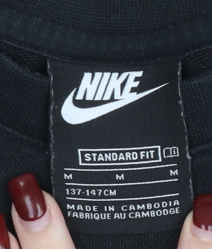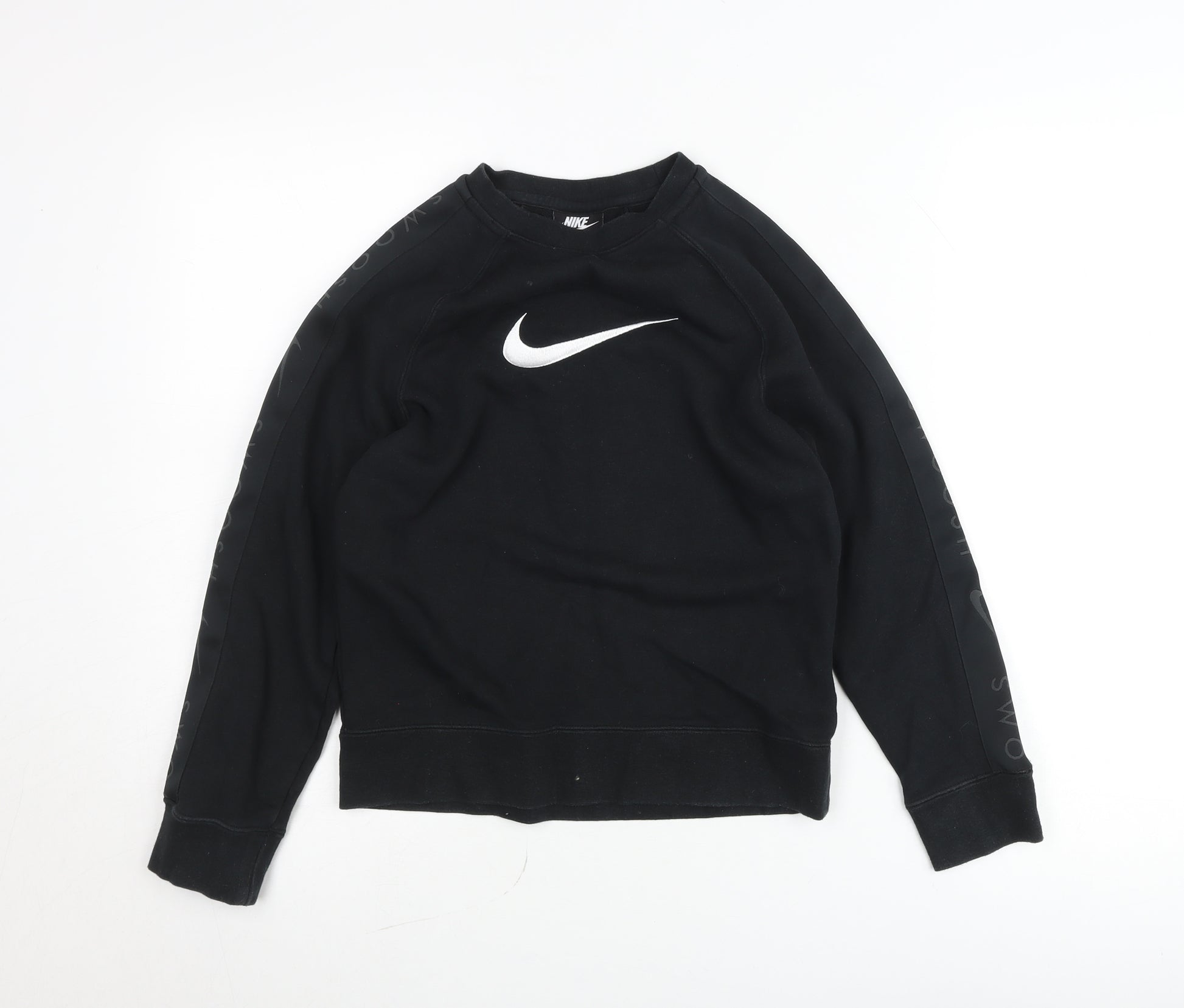 Upgrade your child’s casual and active wardrobe with this classic Nike boys’ pullover jumper, perfect for everyday wear and sporting activities. In a versatile black colourway with Nike’s iconic white swoosh logo across the chest, this jumper embodies sporty style and comfort in one. Designed in a regular fit with long sleeves and a crew neckline, it delivers ease of movement whether for school, outdoor activities, or lounging at home.Crafted from a breathable and durable blend of cotton, polyester, and elastane, this lightweight knit fabric ensures both comfort and resilience for frequent wear. The fabric composition of 80% cotton, 20% polyester, and 2% elastane provides a soft feel against the skin while retaining shape even after multiple washes. With a length of approximately 52cm, this pullover is tailored for boys aged 11-12 years (137-147 cm height range).Designed for adaptability, this Nike jumper works well across seasons. It’s ideal layered during the autumn and winter months or worn on cooler spring days. Its casual and sporty look makes it suitable for a wide range of occasions – from school uniform layering to sports practice or relaxed weekend wear. The simple pullover design provides ease of use, while ribbed cuffs and hem enhance a snug fit and silhouette.The bold Nike swoosh graphic on the front adds a stylish edge, giving this jumper instant recognition as a trusted sportswear essential. Built with performance and activity in mind, it’s well-suited for football, basketball, jogging, training sessions, or simply achieving a sporty look day-to-day.This jumper is in excellent pre-loved condition with no stains or rips, showing very minimal general wear. Though it does not come with its original sales tags, it retains Nike’s quality and reliability. Easy-care, machine washable fabric offers convenience to parents while ensuring the jumper consistently looks fresh and ready for wear.Practical, stylish, and high-quality, this Nike boys’ black pullover jumper is a wardrobe essential that combines comfort with lasting appeal – perfect for active youngsters or those who love sporty streetwear fashion.