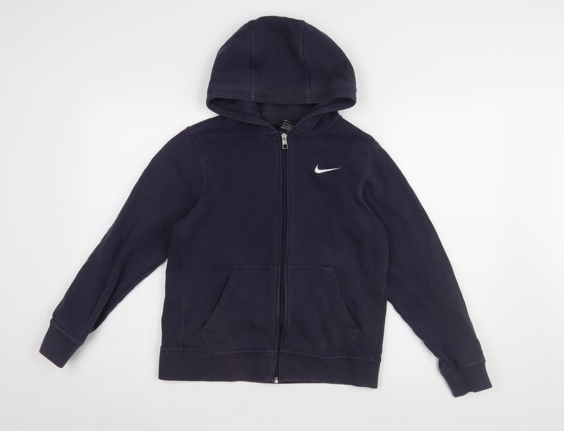 Embrace sporty style and comfort with this Nike Boys Blue Hoodie Jacket, perfect for the active youngster. Crafted from a blend of 80% cotton and 20% polyester, the jacket ensures durability and a cosy fit all year round. Ideal for casual wear, whether lounging at home or heading out for activities. The soft fleece fabric keeps warmth in, making it a staple piece for any boy's wardrobe. Featuring a full zip closure along with a practical hood, this jacket offers both functionality and fashion. Zipped pockets provide secure storage for small essentials on the go. The jacket's regular fit and mid-length design make it versatile and suitable for different body shapes. With the iconic Nike logo accentuating its sporty theme, this hoodie combines style and brand appeal. The garment is easy to care for, being machine washable, and has been maintained in excellent condition. Elevate any casual outfit with this must-have Nike jacket, designed for boys aged 12-13 years. Perfect as a gift or an addition to the wardrobe, it's sure to become a favourite piece.
