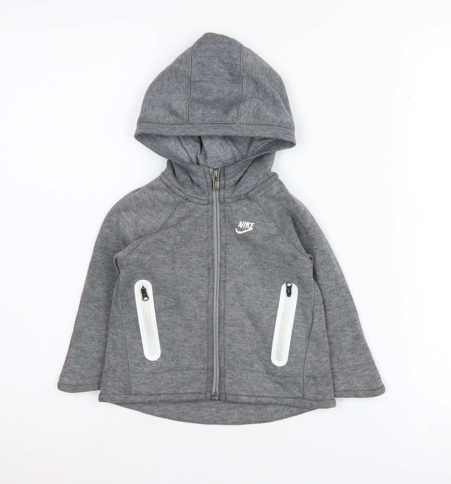 Keep your little one cosy with this Grey Hoodie Jacket from Nike, designed for boys aged 18 months. Made from a soft blend of 69% cotton and 31% polyester, this jacket is both comfortable and durable. Featuring a stylish hood and a full zip closure, it provides both convenience and warmth. The jacket includes zipped pockets for added utility and displays the Nike logo for a touch of sporty flair. Ideal for casual outings in cooler weather, this hoodie fits perfectly into any little boy's wardrobe. Condition is very good with a slight mark visible, ensuring you get great value with this purchase. Priced competitively for similar styles online.