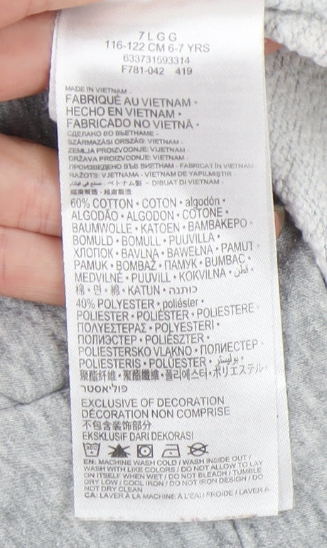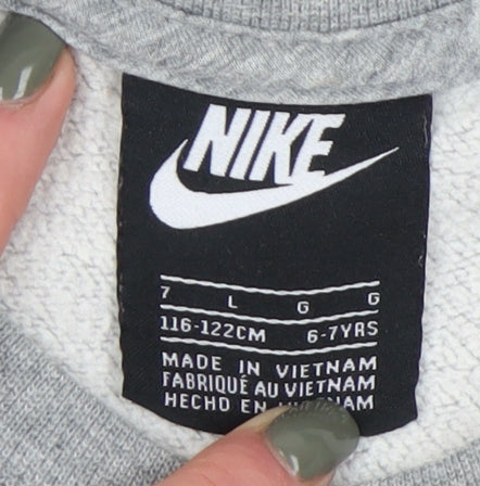 This Nike Boys' pullover sweatshirt is a must-have addition to any young athlete's wardrobe. Made with a comfortable blend of 60% cotton and 40% polyester, it offers both softness and durability. Featuring a classic crew neck and long sleeves, it is perfect for layering or wearing on its own. The stylish grey colour and prominent Nike logo make it a versatile piece suitable for all seasons. Ideal for casual wear, it fits comfortably on boys aged 6-7 years. With a regular fit and graphic print, this sweatshirt ensures a trendy look while providing comfort for everyday activities. Note that there are slight signs of wear and no original sales tags present.