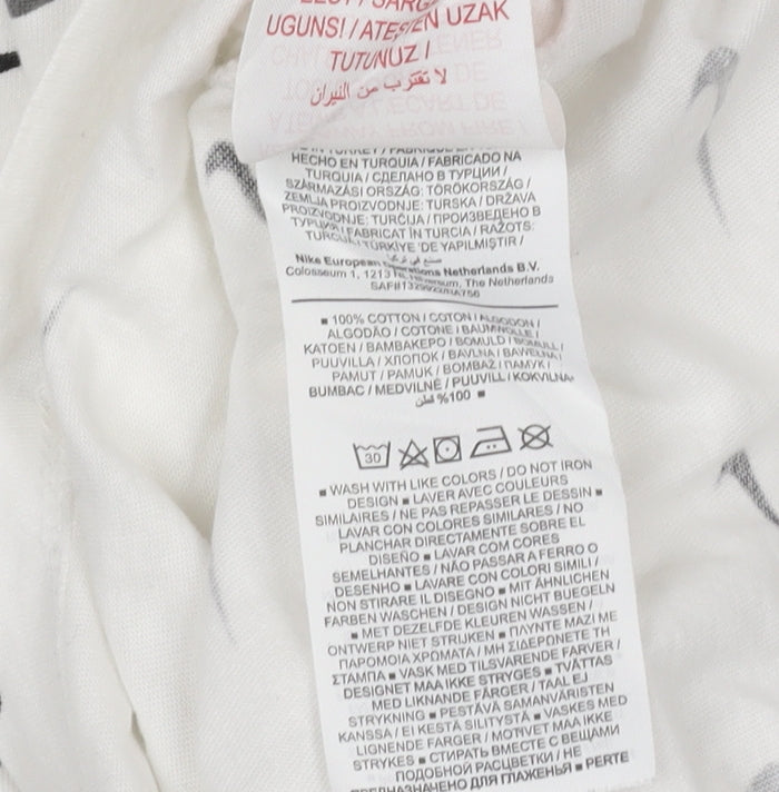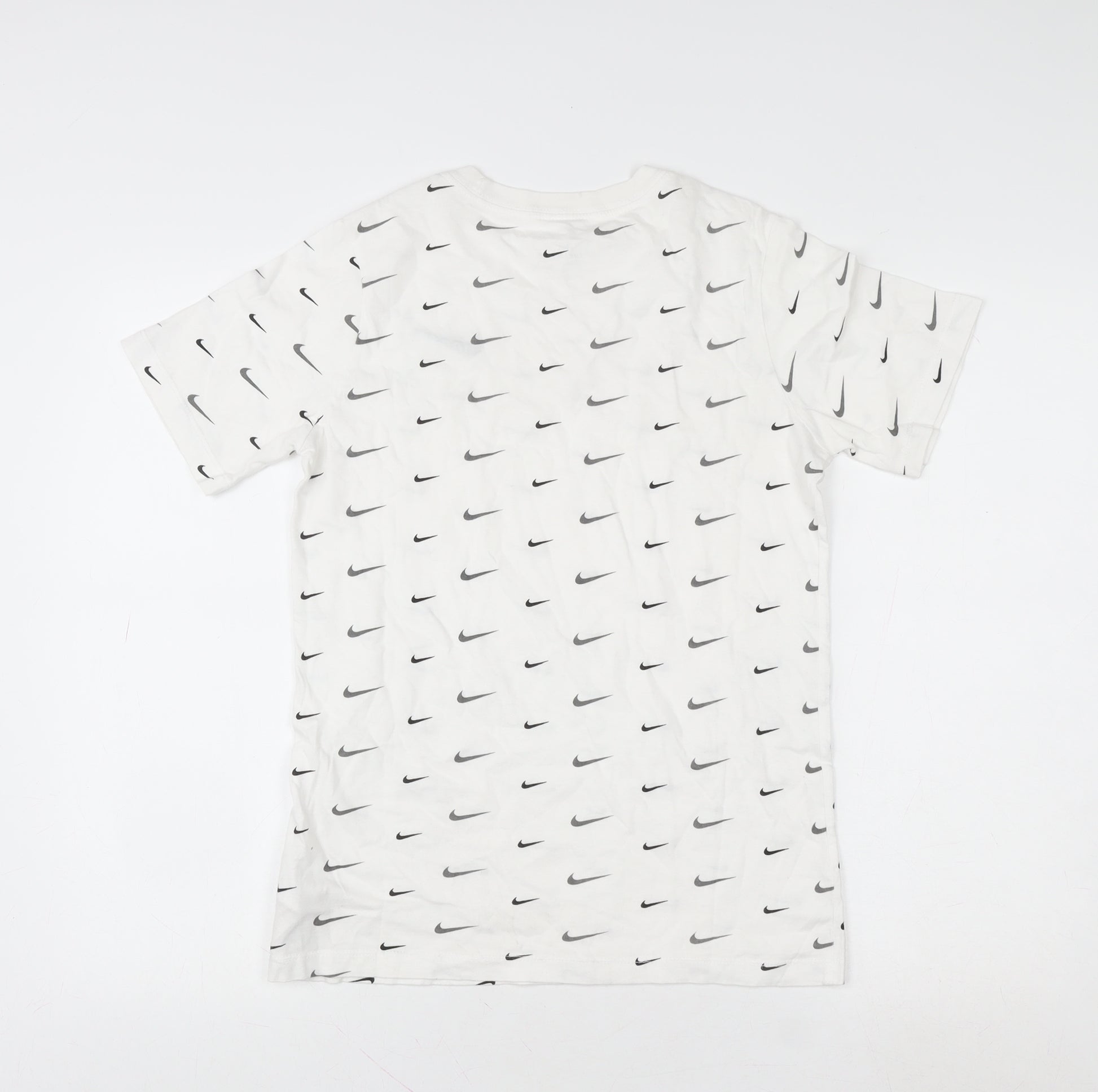 Elevate your boy’s casual wardrobe with this stylish Nike Boys White Graphic Logo T-Shirt. Designed for comfort and everyday wear, this iconic tee features the instantly recognisable Nike Swoosh logo printed in a repeating pattern across the front and back, giving it a modern sporty edge. Crafted from 100% soft cotton, it ensures excellent breathability and a lightweight feel, keeping your child cool and comfortable whether at school, out with friends, or playing sports. The regular fit and crew neckline offer a relaxed, easy-to-wear style that pairs effortlessly with jeans, joggers, or shorts for any casual occasion.Perfect for active youngsters, this Nike T-shirt is part of “The Nike Tee” collection, known for its quality construction and reliable wear. Its versatile white colourway complements any outfit while maintaining a clean, sporty look. Designed to suit boys aged 13–14 years (147–158 cm), this tee provides a great fit that allows for easy movement and all-day comfort. Ideal for a variety of activities, it works well for gym sessions, football training, running, or simply lounging in style. Made with durable yet soft cotton jersey fabric, this T-shirt is machine washable and easy to care for, making it a convenient addition to any wardrobe. With a condition rating of Excellent and no visible flaws or tags, it represents great value for a premium brand tee. The lightweight material and breathable design make it suitable for summer wear but also ideal for layering in cooler months.Add this Nike Boys White Graphic Logo T-Shirt to your child’s collection for a casual, sporty look that combines comfort, versatility, and the trusted quality of Nike. A perfect everyday staple for those who appreciate iconic sportswear style at an affordable price.