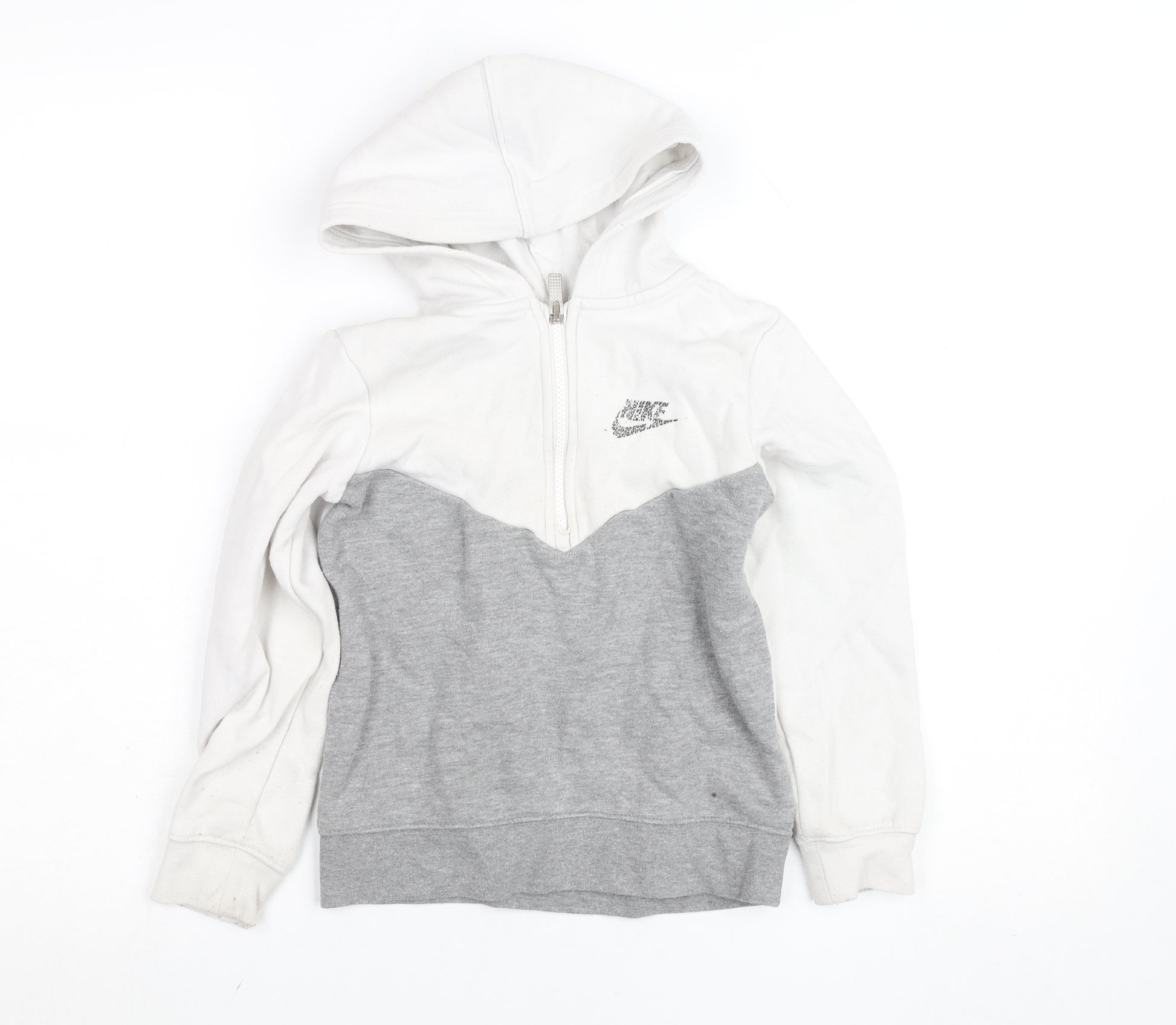 Keep your youngster feeling snug and sporty with this Nike boys' full zip hoodie in classic white and grey. Crafted from a soft cotton blend fleece, this hoodie delivers warmth, comfort and durability, making it perfect for everyday wear or active adventures. The full zip fastening allows for easy layering, while the cosy hood helps protect against chilly weather. Featuring Nike’s iconic swoosh logo across the chest, this hoodie blends signature style with practicality, reflecting the brand’s strong athletic heritage. Designed with a regular fit, ribbed cuffs and hem, it ensures a comfortable and secure feel while maintaining freedom of movement during playtime or outdoor activities. The soft brushed interior provides extra insulation and a gentle feel on the skin, ideal for cooler months and transitional weather. Its simple yet modern colourblock design in white and light grey guarantees effortless pairing with joggers, jeans or track pants, making it a versatile staple in any young wardrobe. Whether for school runs, weekend games, or casual outings, this hoodie embodies Nike’s commitment to comfort and performance. A must-have for active kids who love sporty apparel with everyday practicality. Light surface marks and minimal signs of wear are present but do not detract from its excellent condition. Perfect for parents seeking a reliable, fashionable and easy-care piece from a trusted brand enjoyed worldwide.