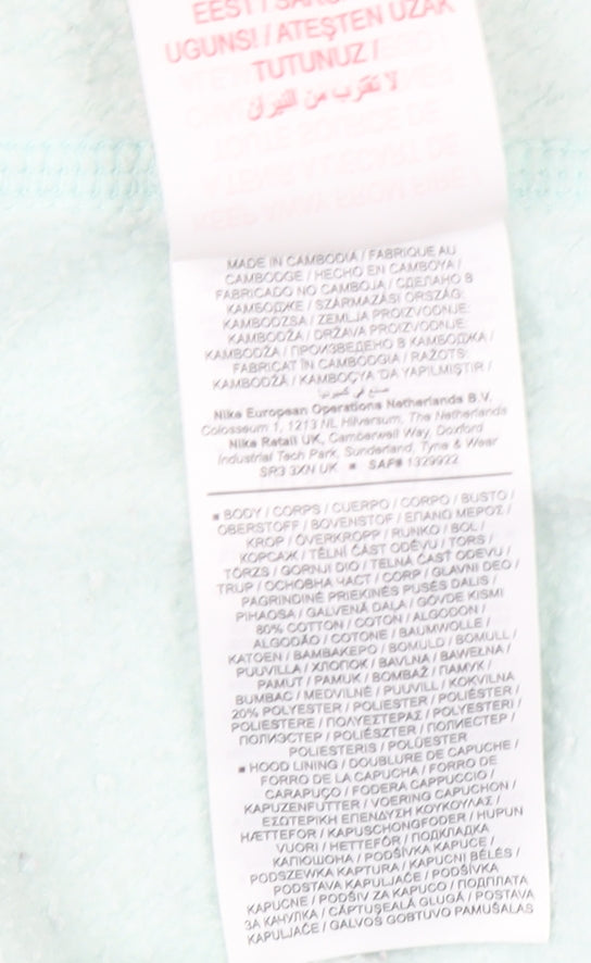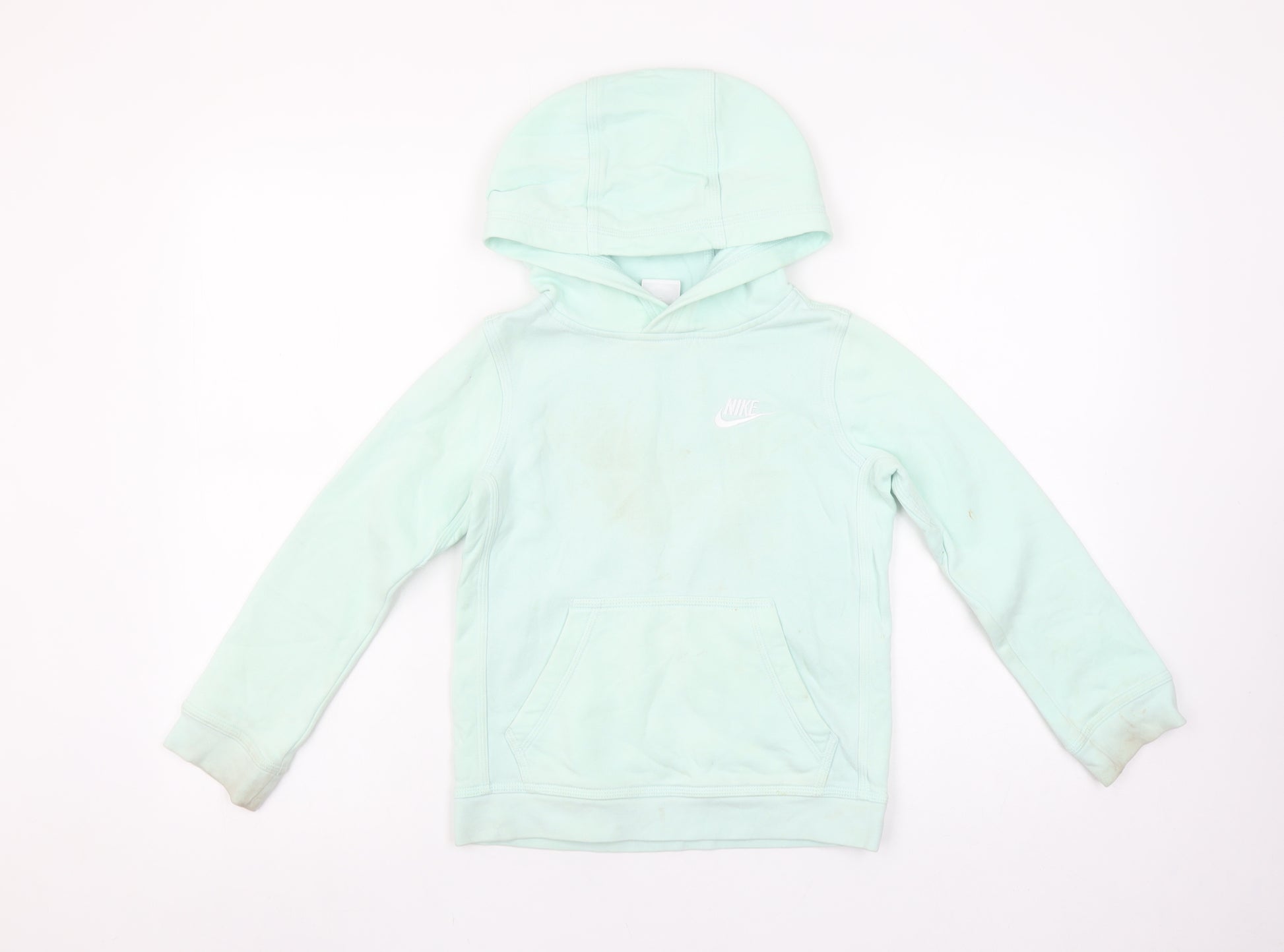 Keep your little one comfortable and stylish in this Nike Girls Pullover Hoodie in soft pastel green. Designed with an easy slip-on pullover style, this cosy hoodie is made from a comfortable cotton and polyester fleece blend that feels soft on the skin while keeping warmth locked in on cooler days. The regular fit allows for unrestricted movement, perfect for school, play or casual outings. Featuring Nike’s signature logo on the chest, it adds a sporty and timeless touch that goes with everything. The hoodie includes long sleeves and a front kangaroo-style pocket ideal for keeping hands warm or holding small essentials, while the hood adds extra protection from the chill. Suitable for the cooler months of autumn, winter and spring, the fleece lining enhances comfort and insulation. Although pre-loved, this hoodie still has plenty of wear left. There are some visible marks on the body and sleeves, but the structural integrity remains solid with no holes or tears. The fresh mint-green hue gives a modern yet relaxed sporty look suitable for everyday wear or light physical activity like training or school sports. Easy to care for and machine washable, this hoodie combines practicality with classic Nike quality. An excellent wardrobe essential for young girls who want warmth, comfort and cool sporty style in one piece, this item offers great value and effortless wearability for any active lifestyle.