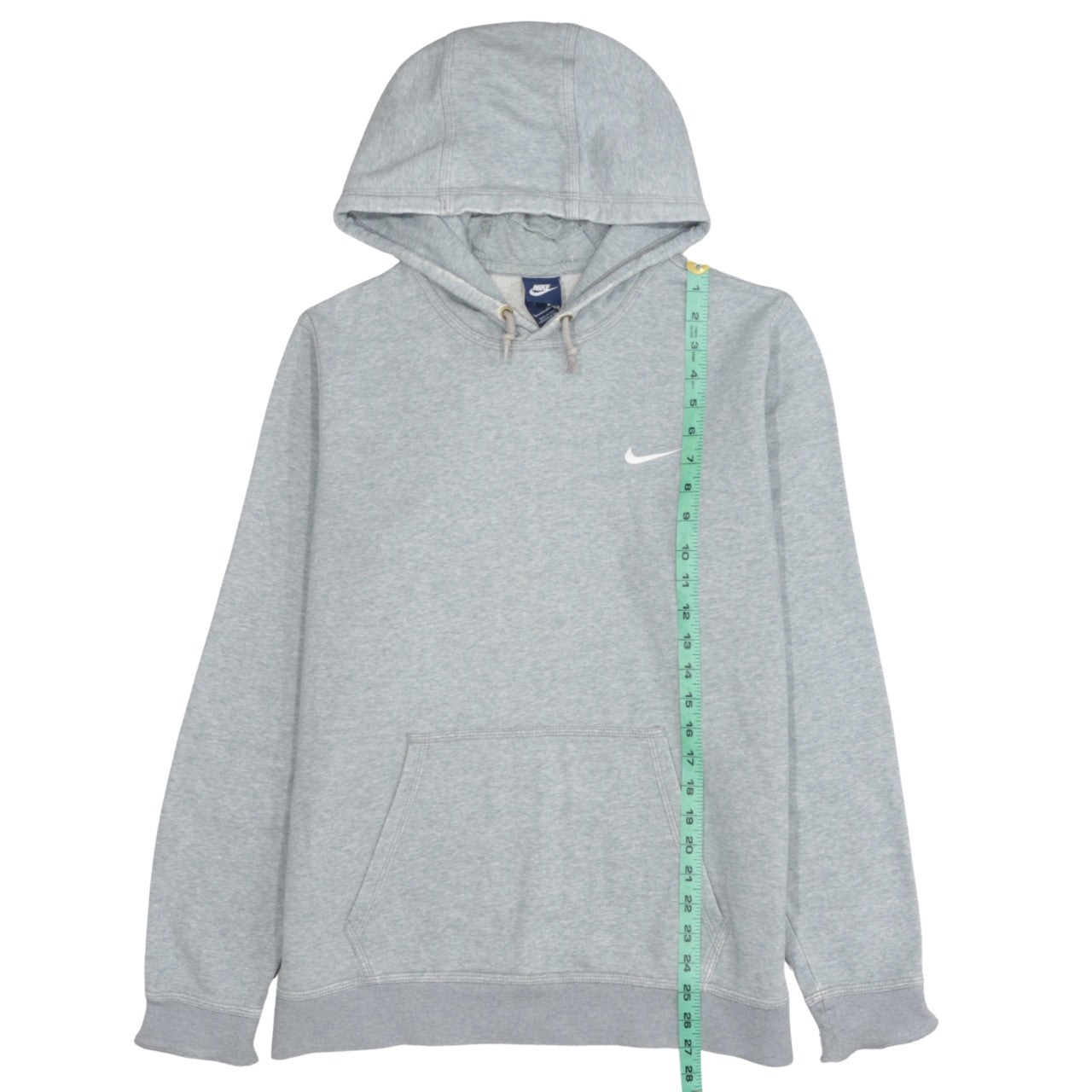 This men’s Nike grey pullover hoodie offers a timeless athletic style combined with everyday comfort. Made from a soft blend of 80% cotton and 20% polyester, it features a classic fleece texture that provides warmth without feeling heavy. The regular fit ensures ease of movement, perfect for workouts, leisure, or layering during cooler months. The front displays the iconic embroidered Nike swoosh logo for subtle brand recognition, while the kangaroo pocket and adjustable drawstring hood add practical touches ideal for daily use. Designed for versatility, the hoodie is suitable for a variety of activities such as gym training, running, football, or casual wear, making it a staple in any man’s wardrobe. The grey colourway ensures easy pairing with both athletic and streetwear outfits. While showing light wear on the sleeve, the hoodie remains in very good condition overall, with durable ribbed cuffs and hem maintaining its shape. Easy to care for and machine washable, this Nike hoodie promises long-lasting comfort, making it an effortlessly stylish and functional choice for year-round wear. A dependable and recognizable piece, this pullover bridges sporty design and relaxed comfort seamlessly, perfect for those who appreciate authentic Nike quality and minimalistic aesthetics.