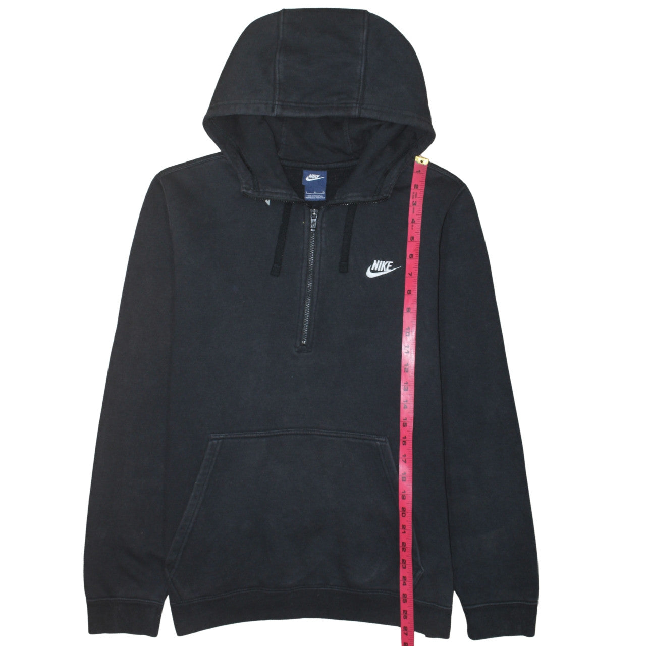 Step up your casualwear game with this classic Nike Men’s Pullover Hoodie in sleek black. Designed for comfort and everyday wear, this hoodie is crafted from a soft and durable cotton-polyester blend that combines warmth with breathability. The half-zip front provides easy on-and-off convenience as well as an adjustable look, while the drawstring hood ensures a snug fit on cooler days. Featuring Nike’s signature embroidered logo on the chest, this hoodie offers an instantly recognisable touch of sporty style. Its kangaroo pocket is perfect for keeping your hands warm or storing small essentials. The regular fit and long sleeves provide freedom of movement, making it suitable for gym sessions, running, and casual outings throughout autumn, winter, and spring. The fleece fabric delivers both insulation and comfort, ensuring reliable wear across all seasons. Machine washable for easy care, this hoodie combines practicality with laid-back modern appeal. Despite light signs of previous use, it remains in excellent condition with no visible damage or marks. Ideal for everyday wear, it effortlessly balances sporty vibes with understated streetwear style. Whether layered under a jacket on colder days or worn alone, it’s a versatile wardrobe essential for any Nike enthusiast or fan of comfortable, high-quality athletic wear. A reliable choice for running errands, relaxing at home, or hitting the gym, this hoodie showcases Nike’s consistent commitment to performance and design. Ready to pair with joggers, shorts, or jeans, it’s a must-have piece that offers timeless comfort and iconic branding. Don’t miss out on this affordable, well-kept Nike staple — practical, stylish, and ready to wear.