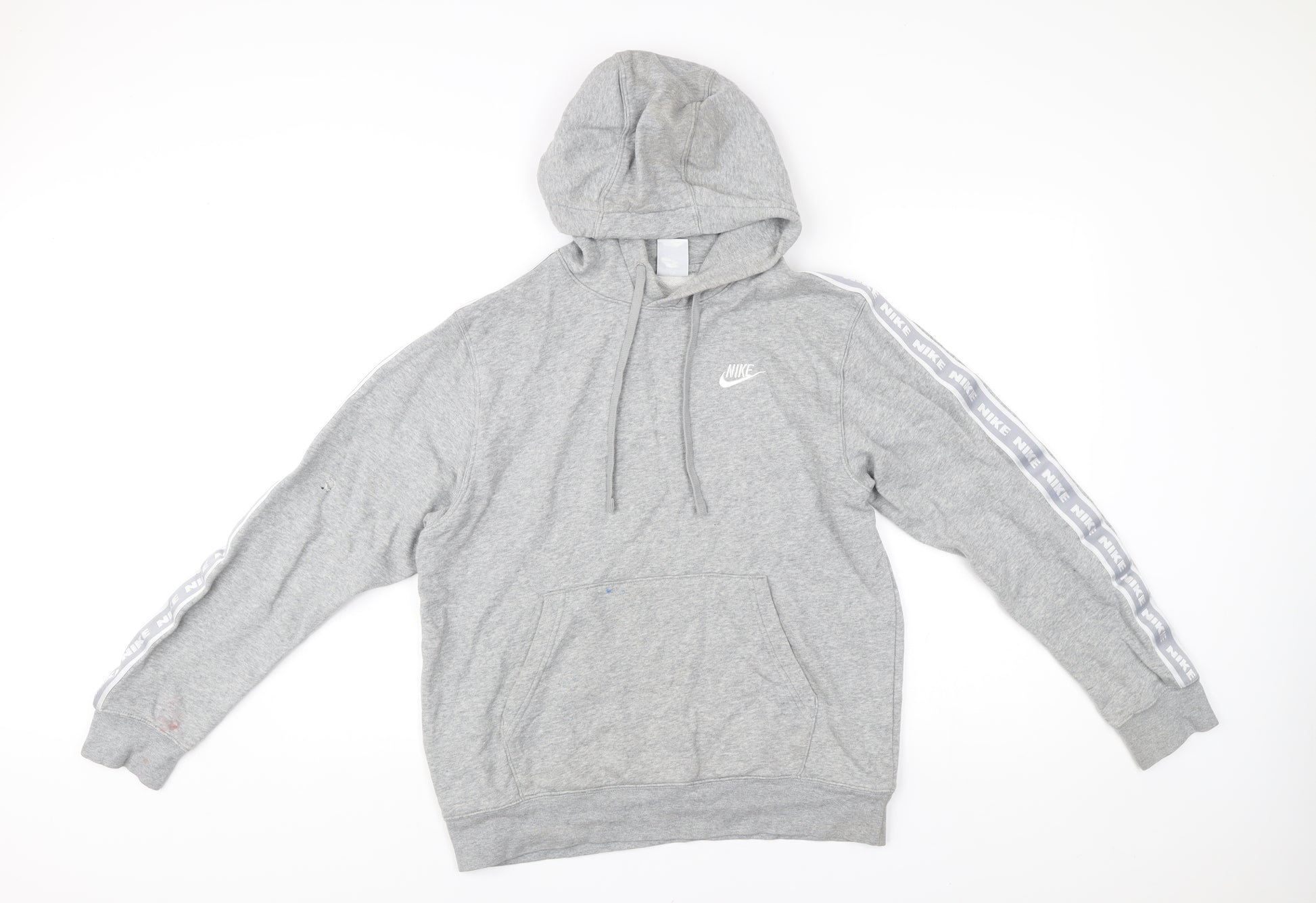 This Nike men's grey pullover hoodie is the perfect addition to any casual wardrobe, blending a sporty aesthetic with classic comfort. Constructed from a durable and comfortable blend of 80% cotton and 20% polyester fleece, it offers softness, breathability, and a reliable fit for everyday wear. The regular fit makes it versatile, while its crew neckline and long sleeves provide easy styling, perfect for cooler days. Designed in a stylish grey colour, it features the iconic Nike logo on the chest and sporty logo tape detailing along the sleeves, adding a standout accent. With a drawstring hood and kangaroo pocket, it retains the functional design that Nike hoodies are famed for, ideal for both athletic activities and relaxed wear. Its machine washable fabric ensures fuss-free care and long-lasting performance. While this hoodie has some light wear, including a small hole and slight marks, it still holds plenty of life and wearability, making it a great value wardrobe staple. Perfect for gym sessions, running, training, or simply laid-back casual wear, this Nike hoodie blends sporty functionality with timeless streetwear style. An affordable way to add an iconic branded piece to your collection, this hoodie is not only practical but also effortlessly stylish. Ideal for autumn, winter, and spring layering, it is a versatile essential that works across multiple looks, whether paired with joggers, jeans, or shorts. This is a great option for those looking for quality sportswear at a fraction of the new retail price, delivering the trusted performance and style that has made Nike one of the world’s most popular brands.