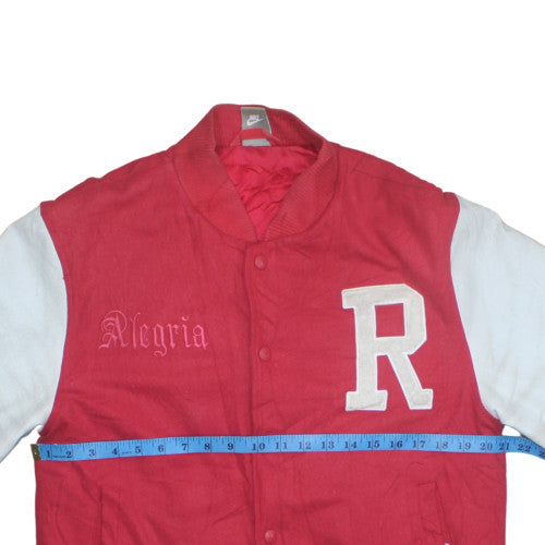 Step out in timeless sporty style with this Nike Men’s Varsity Jacket in vibrant red with white contrast sleeves. Designed for casual wear and lightweight warmth, this jacket captures the authentic collegiate vibe with its bold 'R' appliqué and 'Alegria' embroidery on the chest, while the large griffin crest detail on the back adds a unique and powerful edge. Constructed from a premium mix of 80% cotton and 20% polyester, it offers softness, durability, and all-day comfort. The inner quilted polyester lining ensures extra warmth, making it perfect for cooler autumn or winter days. Featuring a classic stand-up collar, ribbed cuffs and hem, and secure snap button fastenings, it blends practicality with vintage-inspired charm. Two side pockets provide convenient storage for small essentials or keeping your hands warm. This jacket delivers a relaxed yet structured regular fit, suitable for a range of casual occasions—whether heading to a game, campus, or just out and about. The traditional varsity silhouette, accented with logos and stitched detailing, makes it an ideal layering piece that never goes out of style. With subtle signs of previous light wear such as mild sleeve marks, it remains in very good condition with plenty of life left. Machine washable for easy care, this piece is both fashionable and functional. Perfect for sporty fashion enthusiasts or anyone who appreciates classic collegiate outerwear, the Nike Red Varsity Jacket combines comfort, style, and iconic design in one must-have garment.