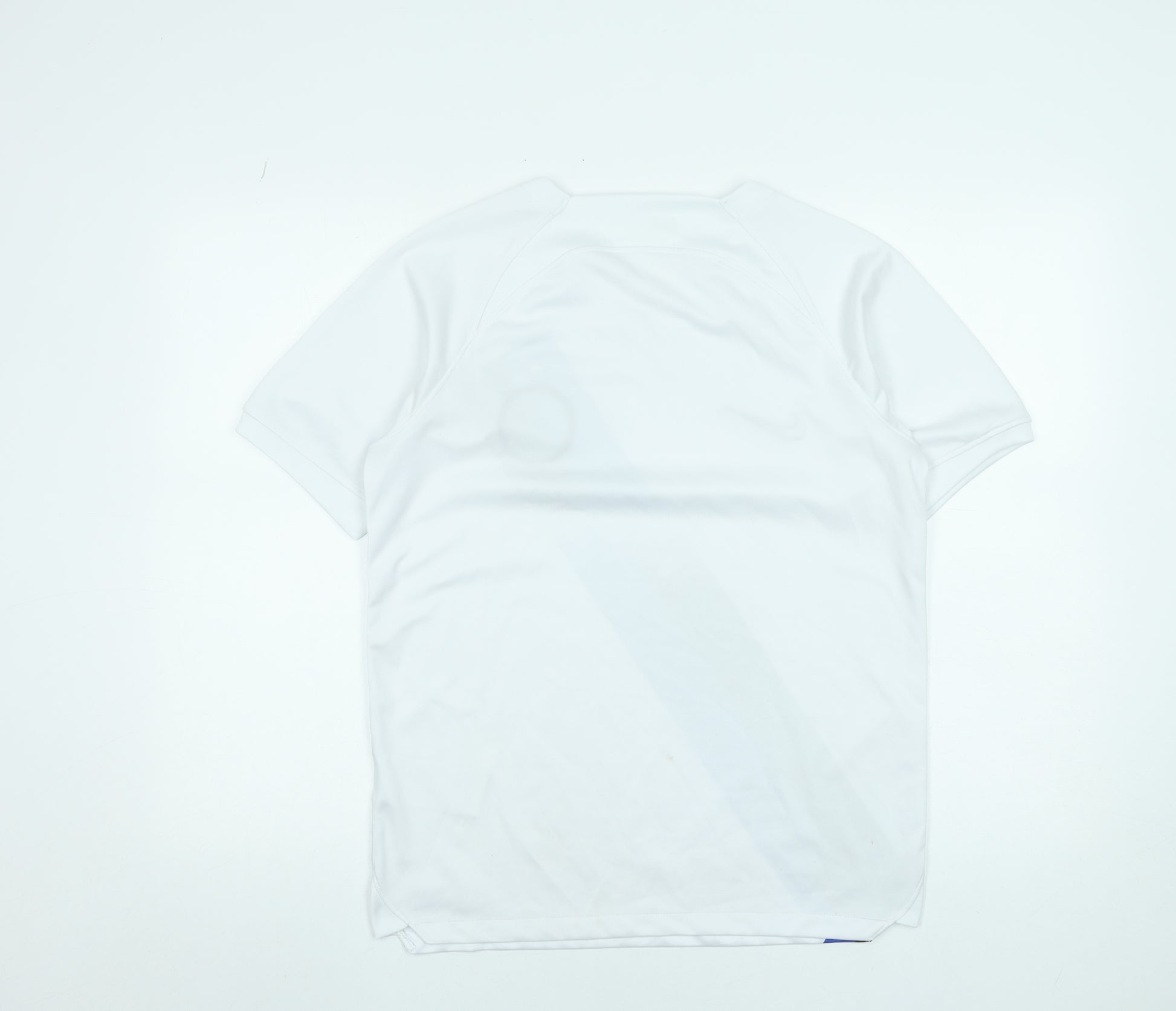 Elevate your football training and casual sporty looks with this Nike Men’s Dri-Fit football jersey in classic white. Crafted for performance and comfort, the athletic fit T-shirt is made from 100% polyester with moisture-wicking Dri-Fit technology that keeps you cool, dry, and focused during high-intensity play or gym sessions. The lightweight and breathable fabric ensures ease of movement, while the premium Nike construction promises durability and style. The short sleeve design with raglan construction enhances range of motion, making it ideal for football, gym training, and everyday activewear. It features a striking colourblock design incorporating the team-inspired stripe in blue and black across the front, with Nike’s iconic swoosh logo adding the perfect sporty touch. The pullover style with a flattering V-neckline completes a sleek and professional athletic look suitable for both casual and performance wear. Perfect for summer workouts, match days, or relaxed weekends, this high-quality jersey provides both function and fashion for football enthusiasts or lovers of authentic sportswear. With a chest measurement of approximately 50 cm and total length around 70 cm, this Size S top is designed for a fitted athletic silhouette. In excellent pre-owned condition, showing minimal signs of gentle use, this piece has been carefully checked to ensure no stains or damage. Perfect for pairing with joggers, shorts, or jeans, it delivers a timeless Nike look built for sport and style. A reliable and versatile addition to any active wardrobe, this jersey is a great choice for those seeking performance and personality in one garment.