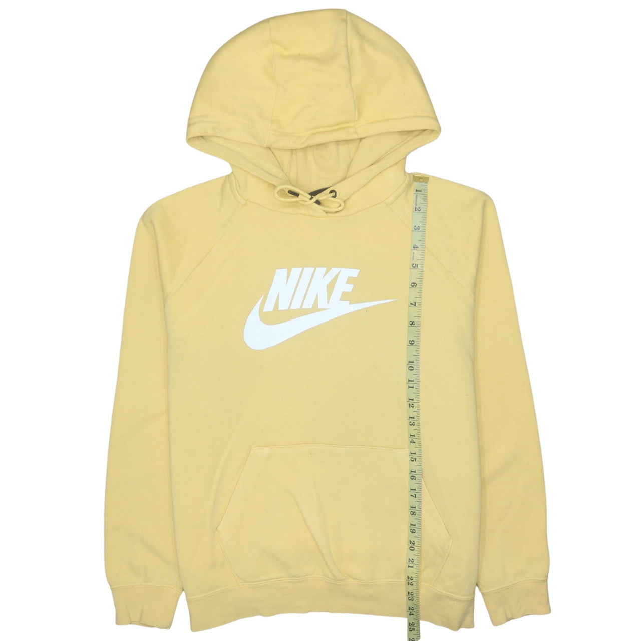 Step out in laid-back athletic style with this Nike men’s pullover hoodie in a soft yellow shade. Crafted from a warm and breathable 80% cotton and 20% polyester blend, this fleece-lined hoodie delivers superb comfort and durability for everyday wear. The large white Nike logo across the chest adds a bold, sporty touch that channels classic streetwear vibes, perfect for both active days and relaxed downtime. Designed with a crew neck and adjustable drawstring hood, it offers flexible comfort and a flattering regular fit. The kangaroo pocket on the front gives practical storage and a casual style that’s ideal for layering through autumn, winter, and early spring. Reinforced ribbed cuffs and hem ensure lasting shape retention, while the fleece texture provides cosy warmth without excess weight. Great for the gym, running, or casual outings, this stylish hoodie brings together premium materials, reliable quality, and iconic branding in one versatile garment. The light wear visible suggests careful use with no flaws, maintaining a fresh and attractive look. Easy to maintain, simply machine wash and enjoy its soft feel season after season. Whether teamed with joggers for training or jeans for everyday wear, this Nike hoodie offers unbeatable comfort, timeless appeal, and dependable performance. A must-have essential for any wardrobe blending sporting heritage and modern casual fashion.