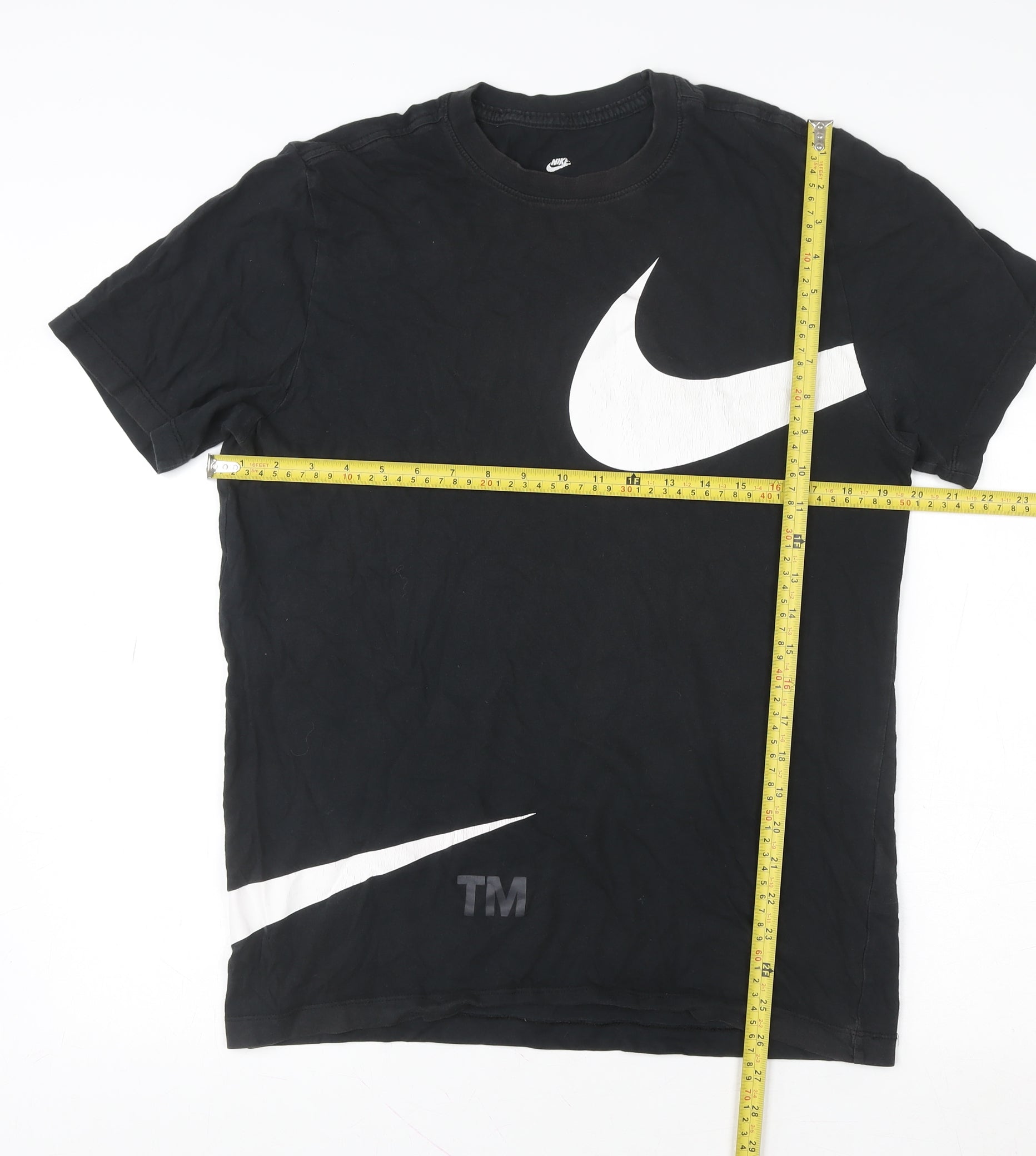 Elevate your everyday wardrobe with this classic Nike Men's Black Graphic Logo Sports T-Shirt in size M. Crafted from 100% cotton jersey fabric, this tee delivers both comfort and breathability, making it ideal for casual wear, workouts, or layering throughout the year. The regular fit ensures ease of movement, while the lightweight and soft texture keeps you cool and comfortable on the go. Featuring the iconic Nike Swoosh logo in a bold oversized print both front and back, this T-shirt makes a strong sporty statement that reflects effortless style. Its crew neckline and short sleeves offer timeless appeal suitable for all ages and a variety of casual looks. Perfect for men with an active lifestyle or anyone who appreciates athleisure fashion, this versatile black tee pairs seamlessly with jeans, joggers, or shorts for a clean, modern finish. The breathable cotton fabric allows moisture control during activity while maintaining its structure after washing. This Nike tee, made in Egypt, exemplifies the brand’s focus on quality production and design appeal. Although pre-owned, it remains in very good condition with only minor signs of wear and no damage to the graphic print, ensuring longevity and continued wearability. Machine washable and easy to care for, it’s a convenient, stylish staple for everyday wear throughout all seasons — whether indoors, outdoors, or at the gym. With its classic Nike branding, comfortable fit, and durable cotton fabric, this shirt is an essential addition to any casual or athletic wardrobe. A perfect piece for those who appreciate Nike’s athletic legacy blended with streetwear style, this T-shirt offers practicality, comfort, and a sharp look that’s always on trend.