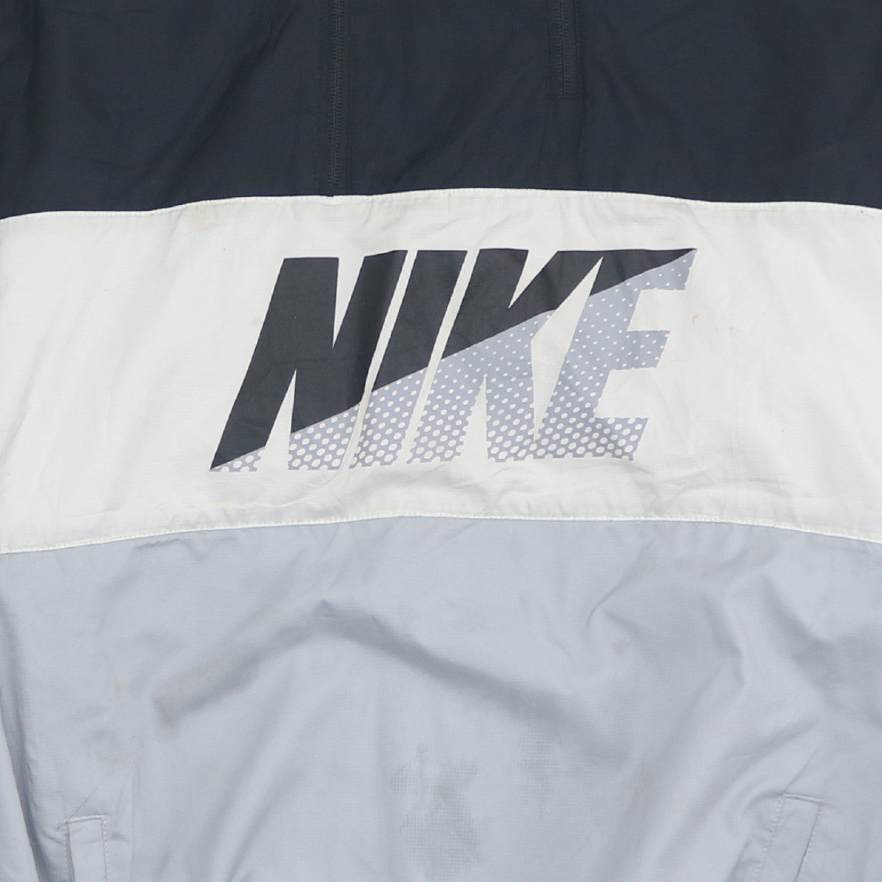 Step up your athletic wardrobe with this Nike Men’s Windbreaker Jacket in a stylish black, white, and light grey colourblock design. Crafted entirely from durable polyester, this lightweight piece is designed for both performance and comfort. The pullover style gives it a contemporary edge, while the elasticated hem and cuffs provide a secure and comfortable fit. The hood offers added protection against the wind, making it perfect for running, jogging, or casual wear during transitional weather.A large NIKE logo across the chest adds a bold and iconic look that stands out, underscoring the brand’s sports heritage. The breathable mesh lining keeps air flowing during active use, while the practical front pockets are ideal for storing essentials or keeping hands warm. Built for everyday training, commuting, or weekend wear, this jacket strikes the ideal balance between functionality and street-ready style.Despite some light markings on the front panel, this windbreaker remains in very good condition, reflecting only gentle previous wear without compromising its structure or performance quality. Perfect for spring and autumn seasons, it makes an excellent layering item over gym gear or casual outfits.Whether you’re out for a jog, heading to the gym, or simply enjoying an off-duty day, this Nike Windbreaker delivers reliable weather protection and comfort in an effortlessly athletic silhouette. Its mid-length fit, long sleeves, and soft polyester fabric make it a versatile choice for multiple activities. Add a classic sportswear essential to your wardrobe—this jacket combines practicality, brand appeal, and comfort, embodying Nike’s dedication to active lifestyle performance and modern streetwear flair.