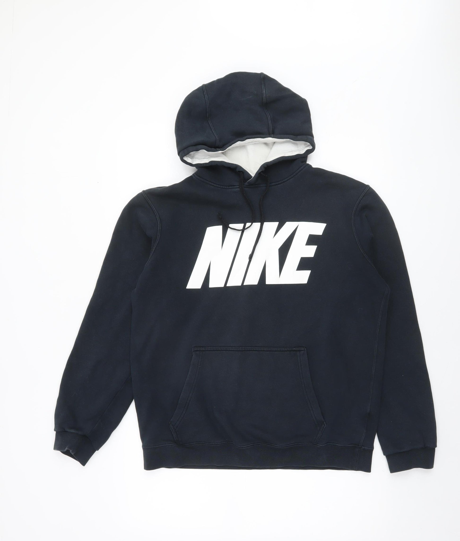 Step up your wardrobe with this classic Nike Men's Black Pullover Hoodie in size Medium, perfect for casual everyday wear or intense training sessions. Crafted from a soft and durable blend of 80% cotton and 20% polyester, this hoodie offers the comfort of breathable cotton with the durability and easy-care benefits of polyester. The cosy fleece fabric feels soft against the skin, keeping you warm through cooler months while remaining lightweight enough for year-round wear. Featuring Nike’s bold white logo across the chest, this piece captures the brand’s signature athletic style and urban appeal, making it a versatile addition to your sportswear or streetwear collection. Designed for men with a regular fit, this hoodie includes practical features like an adjustable drawstring hood for custom comfort and a front kangaroo pocket for convenient storage or to keep your hands warm. The long sleeves with ribbed cuffs help retain shape and provide a snug fit. Ideal for activities such as gym training, running, football, or simply lounging, this hoodie complements any casual outfit. The pullover style adds ease and simplicity, while the black colour provides timeless versatility to pair effortlessly with jeans, joggers, or shorts. This pre-owned hoodie remains in excellent condition, showing only slight general wear and no visible damage, reflecting its quality and care. Machine washable and easy to maintain, it offers both functionality and style for all seasons—autumn, winter, and spring. Whether you’re heading out for a workout, a relaxed weekend, or just layering up, this hoodie combines iconic branding, comfort, and durable design. A reliable and stylish choice for men who appreciate sporty fashion with a touch of everyday practicality. Grab this Nike hoodie now for an unbeatable value and refresh your laid-back wardrobe with authentic athletic wear.