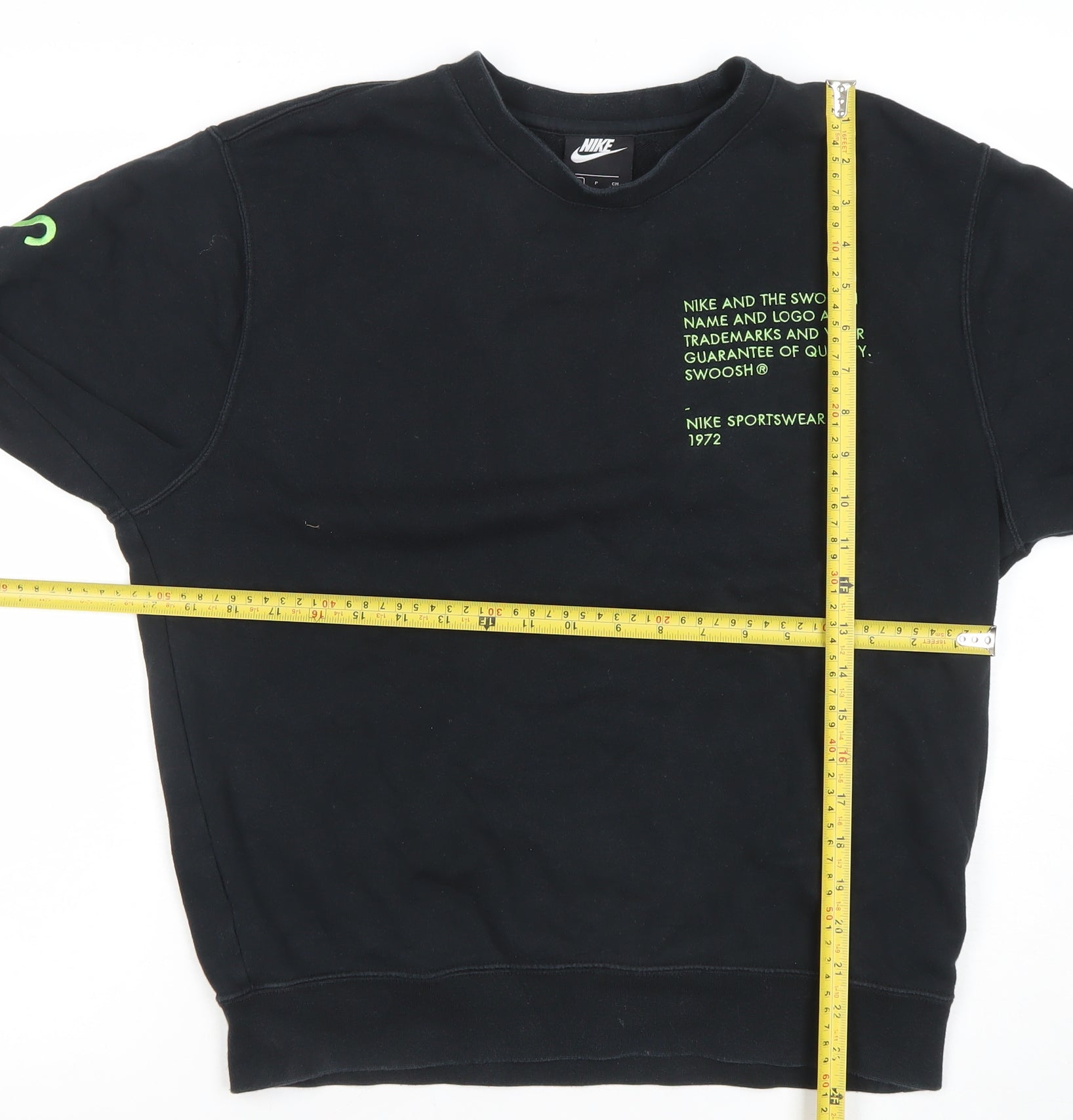 This Nike Men's Black Pullover Sweatshirt delivers the perfect combination of comfort, durability, and classic sporty style. Crafted from a soft fleece blend of 80% cotton and 20% polyester, it offers both breathability and warmth, making it ideal for layering throughout the autumn, winter, and spring months. Designed with a regular fit, this sweatshirt features a timeless crew neckline and long sleeves, ensuring a contemporary yet relaxed silhouette suitable for everyday wear or training sessions. The sweatshirt's design highlights Nike’s heritage through bold embroidered logo detailing on the chest, complemented by the iconic 'Swoosh' graphic text along the left sleeve in bright green, adding a touch of standout branding. The black colourway maintains a sleek, versatile appearance that pairs seamlessly with jeans, joggers, or activewear. Ribbed cuffs and hem maintain the shape and comfort, while the fleece interior provides softness against the skin and lasting warmth. Whether worn during gym and training sessions, casual outings, or simply as part of an athleisure look, this Nike Sportswear sweatshirt offers enduring performance and style. It is machine washable for easy care and long-term wear. The overall condition is excellent with only minimal signs of gentle use and no visible faults, ensuring a great value piece. Perfect for sports enthusiasts or those who appreciate quality streetwear, this versatile Nike sweatshirt is a wardrobe essential for any man who values comfort, authenticity, and iconic branding. Pair it effortlessly with joggers and trainers for a relaxed day look or layer it over a tee for outdoor training. Secure this stylish and practical staple today — a true representation of Nike’s craftsmanship and commitment to performance and fashion.