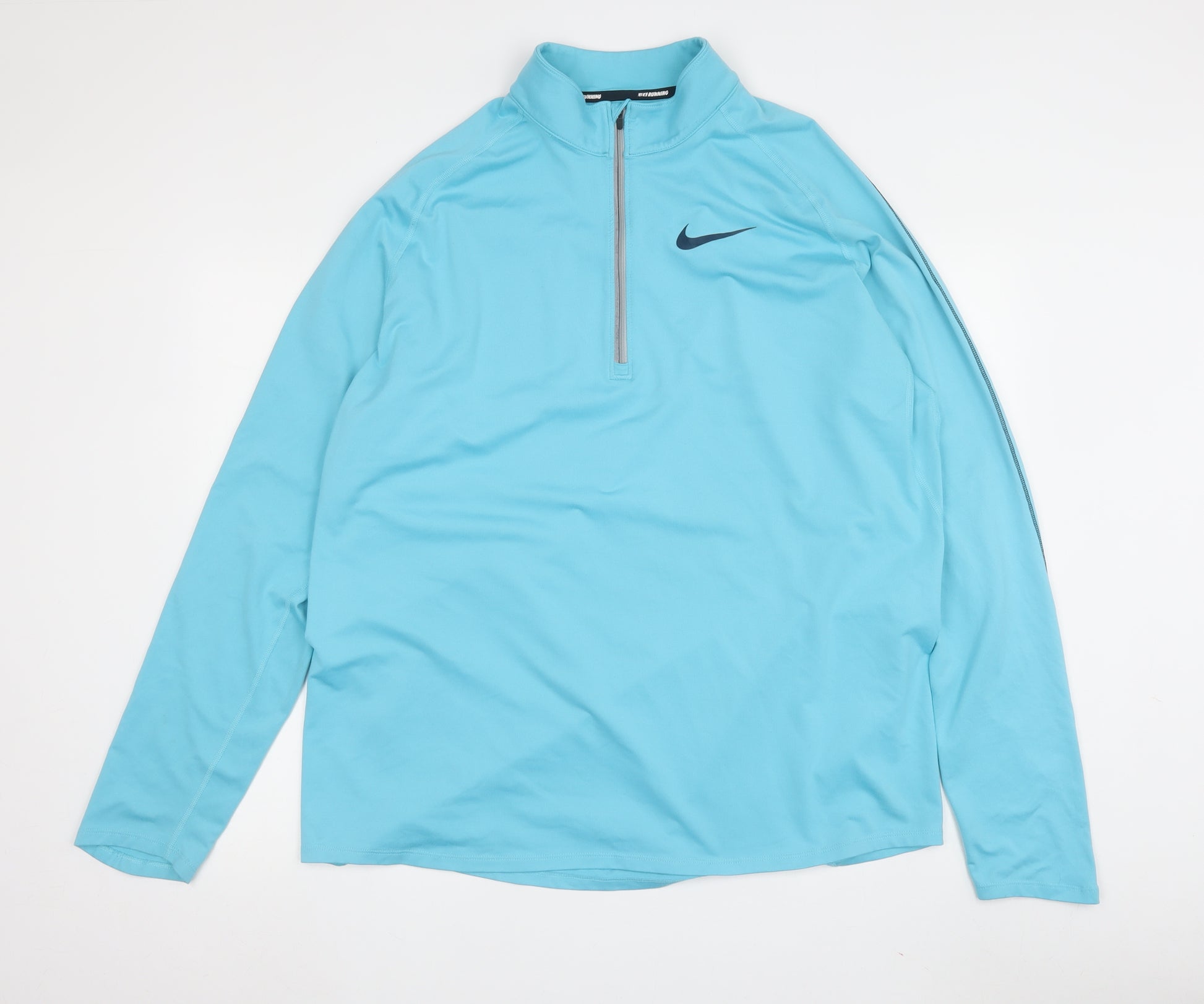 Upgrade your athletic wardrobe with this Nike Running pullover, designed for the modern man who values both style and performance. Crafted in a striking blue hue with a solid pattern, this long sleeve top is perfect for those cold morning jogs or any active outing. The mock neck and full zip closure provide adjustable breathability and added warmth during outdoor workouts. Made from a soft jersey fabric composed of 92% Polyester and 8% Elastane, it offers the perfect blend of comfort and flexibility, ensuring ease of movement. Enjoy the benefits of moisture-wicking technology that keeps you dry and comfortable throughout your run. Emblazoned with the iconic Nike logo on the chest, this top not only delivers on performance but on style too, making it a versatile piece for any athletic collection. Ideal for activewear occasions, it transitions seamlessly from running and jogging to casual day wear. Machine washable for easy care, this pullover is a practical choice for all seasons. Perfect for the athletic enthusiast who doesn't compromise on quality and fashion. Whether you're heading to the gym, going for a run, or simply out for a casual day, this top promises to be your go-to choice. Choose Nike for reliability and style, every step of the way.