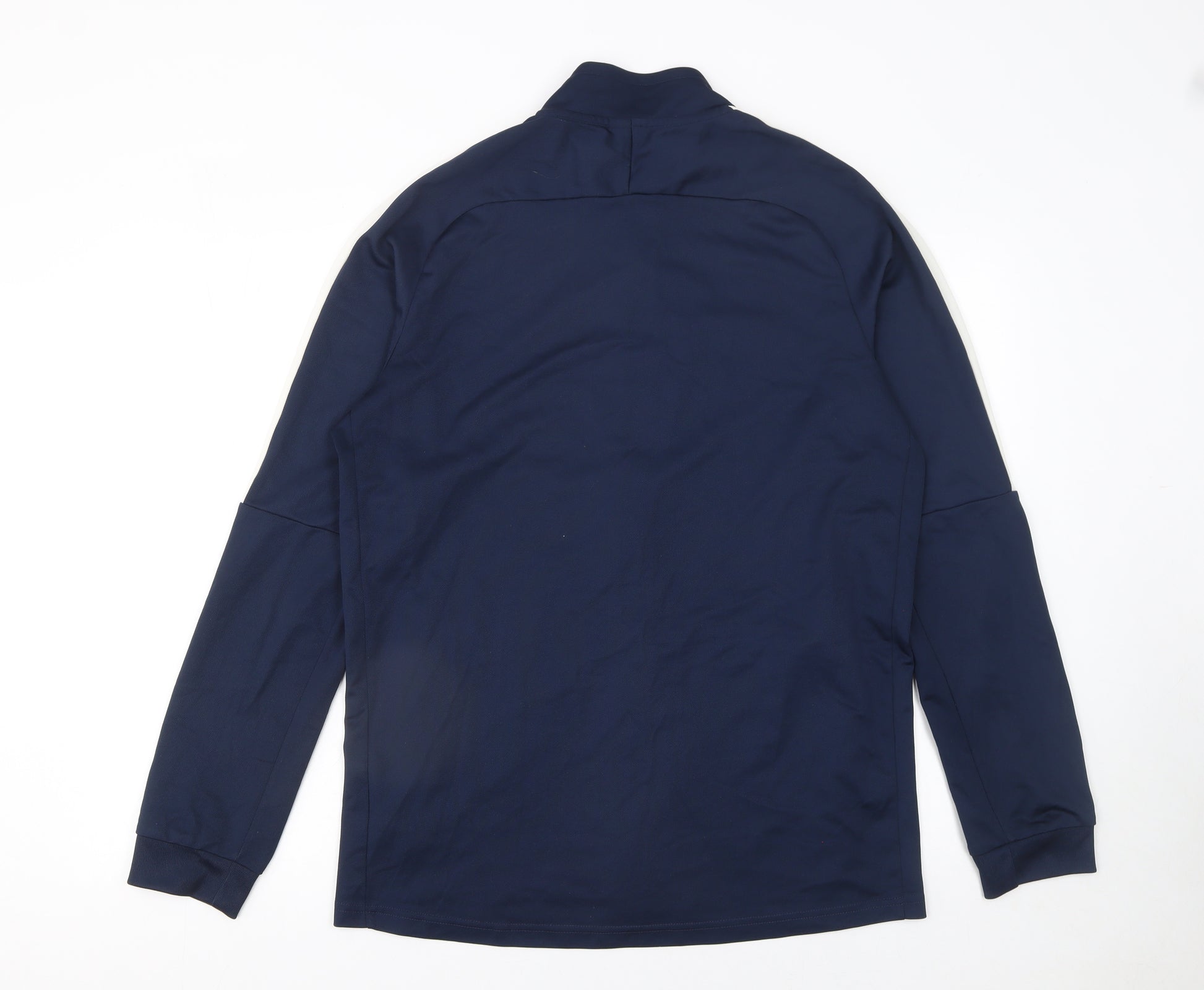 Stay comfortable and stylish with this Nike Men's Dri-FIT Track Jacket in deep navy blue. Designed for performance and everyday wear, this jacket combines functionality with a sleek athletic look that never goes out of style. Crafted entirely from 100% polyester, it utilises Nike’s Dri-FIT technology to wick moisture away from the skin, ensuring you stay dry and comfortable during workouts, running, or casual outings. The lightweight, breathable fabric makes it ideal for layering across multiple seasons while maintaining freedom of movement. Featuring a full front zip closure, stand-up collar, and zippered pockets for secure storage, this mid-length jacket offers both practicality and performance. Its athletic fit contours neatly to the body without restricting flexibility, perfect for football training, gym sessions, or even weekend wear. The contrast white zip and Nike Swoosh logo on the chest add a premium sporty finish. In excellent pre-owned condition with light general wear and no major flaws noted, it reflects the quality and durability expected from Nike sportswear. Machine washable for ease of care, this versatile piece can transition effortlessly from an active session to casual layering with jeans or joggers. Whether cooling down after a workout or heading out for everyday errands, this jacket provides dependable comfort and timeless sports appeal. A smart choice for anyone seeking reliable activewear that complements a range of outfits while offering the trusted performance of Nike’s innovative Dri-FIT technology.