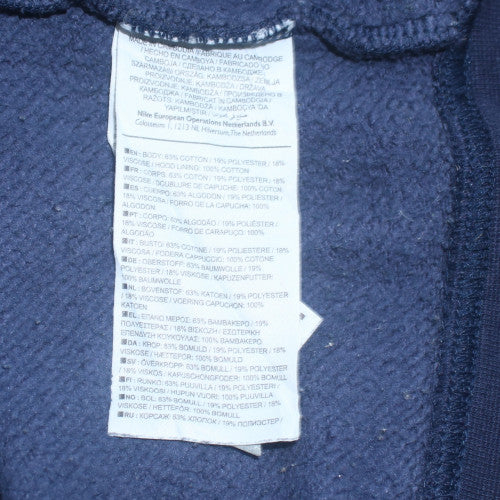 This Nike men's blue full zip hoodie is a stylish and versatile essential designed for comfort and performance. Crafted from a premium cotton and polyester blend, it offers softness and warmth, making it ideal for layering during cooler months. The fleece fabric provides a cosy feel without adding bulk, perfect for casual wear, gym sessions, or outdoor activities. Featuring Nike’s signature logo printed on the chest, this hoodie exudes sporty appeal while maintaining a clean minimalist design. The full zip closure allows easy wear and flexibility, while the adjustable hood offers protection on breezy days. Generous front pockets keep your hands warm or store your essentials conveniently. The long sleeves, ribbed cuffs, and hem ensure a secure and comfortable fit that retains shape after multiple washes. Designed for everyday wear, this versatile hoodie pairs effortlessly with jeans, joggers, or shorts for a relaxed athletic look. Ideal for running, gym training, or laid-back weekends, it suits all-season wear thanks to its breathable yet insulating composition. The dark navy blue colour provides a timeless aesthetic that complements any wardrobe. In excellent condition with only light signs of wear, this hoodie still presents superb quality and durability — evidence of Nike’s commitment to performance-oriented craftsmanship. A must-have for those who appreciate both practicality and sleek sports style, this Nike hoodie promises comfort and confidence whether you’re working out or winding down. Perfect for men seeking an adaptable wardrobe staple, it offers unbeatable versatility and long-lasting wear. Upgrade your sportswear rotation with this classic swoosh-emblazoned hoodie and enjoy the blend of iconic design with everyday functionality. Buy now and experience the enduring appeal and comfort that Nike is renowned for — your go-to choice for modern athletic streetwear.