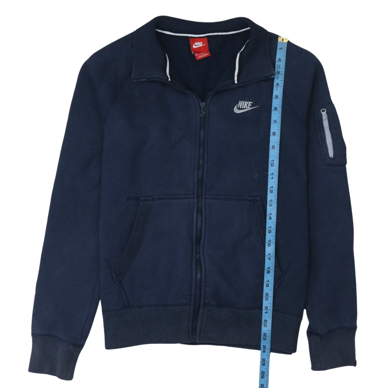 This Nike Men's Blue Full Zip Sweatshirt combines sporty comfort with effortless style, ideal for casual wear or active lifestyles. Crafted from a soft cotton-rich fleece blend, this sweatshirt delivers warmth and breathability without feeling too heavy. Featuring the iconic Nike swoosh logo on the chest, the design exudes athletic appeal while maintaining a classic everyday look. The full-zip fastening provides versatility for layering, making it perfect for both indoor relaxation and outdoor activities during cooler seasons. Two front pockets add practicality, allowing convenient storage for small essentials or keeping hands warm. The collared neckline and ribbed cuffs contribute to a comfortable, secure fit. Constructed from 85% Cotton and 15% Polyester, it ensures durability and long-lasting wear while maintaining a soft, cosy feel. This piece is suited for multiple activities such as gym training, running, walking or simply day-to-day wear due to its breathable and adaptable fleece fabric. The navy blue colour complements a wide range of outfits, from joggers to jeans, offering a sleek, modern aesthetic. In very good pre-loved condition with only minor marks near the pocket, this sweatshirt represents excellent quality and value at an affordable price. Perfect for men seeking a versatile, sporty layering option that transitions seamlessly from workouts to weekends, this Nike sweatshirt delivers both function and timeless style. Easy to maintain and machine washable, it’s designed for all seasons, particularly ideal for autumn, winter and spring wear. Grab this wardrobe staple today to enjoy dependable Nike craftsmanship, everyday comfort and a classic fit that’s always on trend.