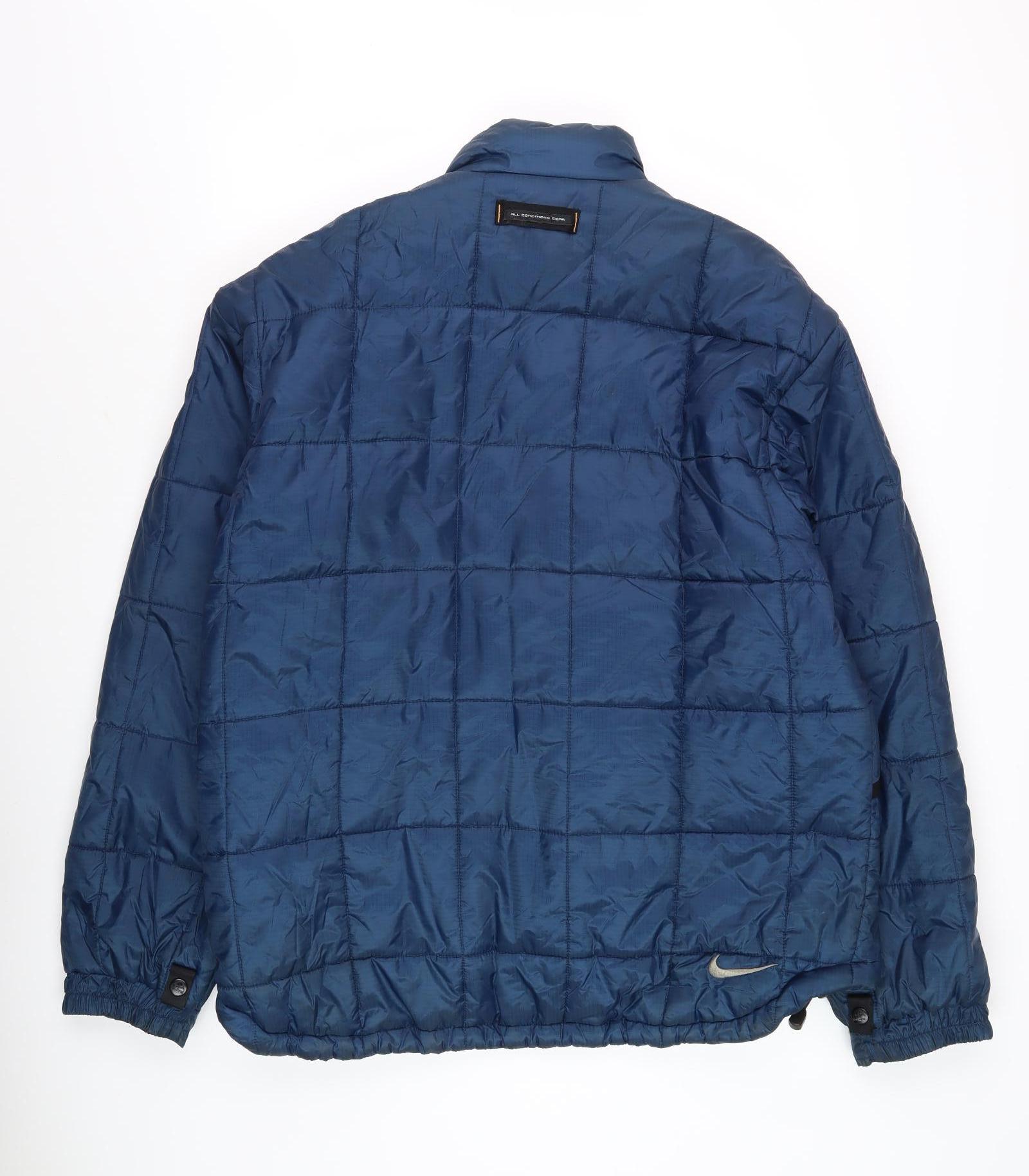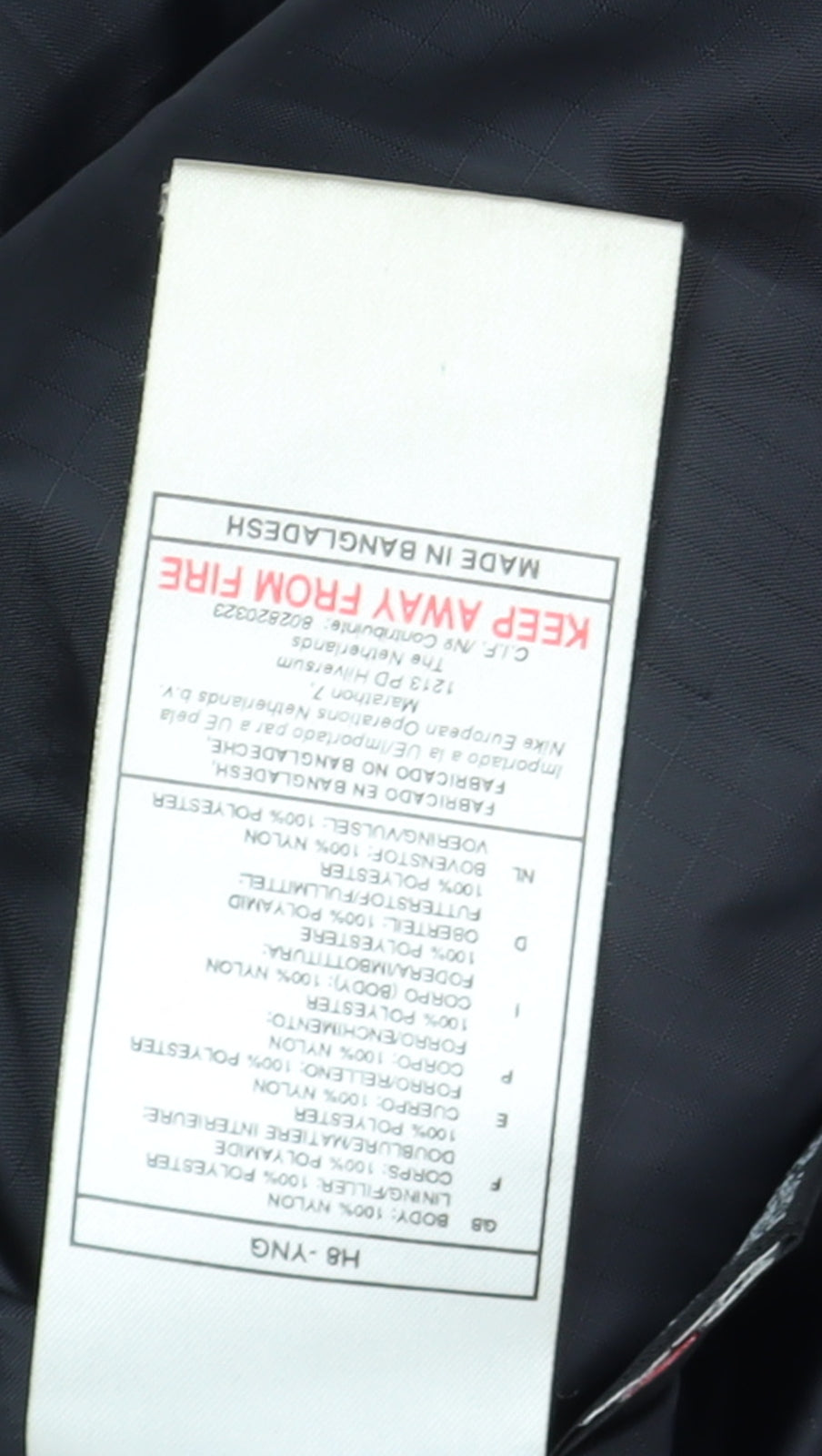 Stay warm and stylish with this Nike puffer jacket, perfect for the winter season. Crafted in a bold blue colour, this men’s jacket is designed with functionality in mind. Featuring a full zip closure, it offers easy wear and removal, while the polyester outer shell and nylon lining ensure optimum insulation against the cold. The jacket sports a regular fit and is designed for comfort, making it ideal for casual wear or outdoor activities. With a mid-length design, it provides extra coverage and warmth during those nippy days. Nike's signature logo adds a touch of sports-themed style, enhancing its casual appeal. This jacket is machine washable, ensuring that upkeep is hassle-free. Despite slight wear, it remains in excellent condition and promises durability. Whether you're heading out for a walk, or need a reliable layer for everyday errands, this puffer jacket is a versatile addition to any wardrobe. Acquire this excellent winter wear at an affordable price and enjoy the blend of comfort and brand reliability.
