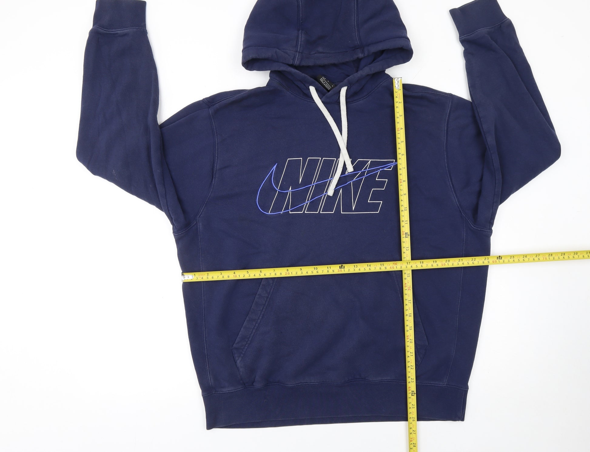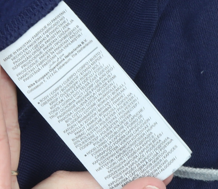 Step out in effortless athletic style with this Nike Men's Blue Pullover Hoodie, crafted in a comfortable fleece blend ideal for all-season wear. Designed for a relaxed everyday fit, this hoodie combines sporty energy with everyday versatility. Made from a soft 80% cotton and 20% polyester blend, it offers breathable warmth and durability, perfect for layering during cooler months or wearing on its own when you want casual comfort. The deep navy-blue colourway is timelessly stylish, while the bold Nike logo across the chest adds an unmistakable touch of brand heritage and streetwear appeal.This hoodie features a drawstring closure at the hood for adjustable coverage, ribbed cuffs and hem for enhanced fit retention, and a classic kangaroo pocket providing warmth for your hands or easy storage for small essentials. The fleece fabric feels soft on the skin, delivering both comfort and practicality whether you’re heading to the gym, relaxing at home, or out on the go. The pullover design ensures simple wearability, making it a wardrobe essential for men who value ease and style.Perfect for a variety of casual activities such as training, running, football, or simply sporting an everyday street-ready look, this piece works effortlessly with jeans, joggers, or shorts. Its long sleeves and crew neckline make it appropriate across autumn, winter, and spring seasons. The hoodie is machine washable for convenience, built to retain its shape and appearance after repeated wear.Though gently worn, this sweatshirt remains in very good condition with only light signs of previous use and a small mark on one sleeve, which does not affect overall appearance or wear. Combining comfort, practicality, and the unmistakable Nike aesthetic, this is an essential pullover hoodie that delivers both performance and style for everyday life.