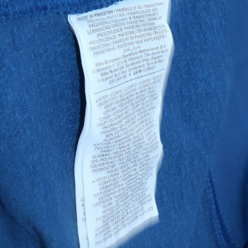 Upgrade your casual wardrobe with this classic men's Nike blue pullover hoodie, designed for everyday comfort and timeless sporty style. Made from a soft and durable blend of 80% cotton and 20% polyester fleece, this hoodie delivers warmth, breathability, and lasting comfort through every season. Featuring a regular fit that offers easy layering, it is ideal for wearing during workouts, rest days, or weekend outings. The hoodie comes in a striking blue colour, complemented by embroidered Nike logos on the chest and front pocket – a subtle yet stylish accent that showcases authentic brand quality. The adjustable drawstring hood adds practicality and protection from the elements, while the spacious front kangaroo pocket offers convenience and a relaxed look. The ribbed cuffs and hem provide a snug finish that helps retain shape after multiple wears and washes.Perfect for autumn, winter and spring wear, this versatile piece suits a range of activities – from gym sessions, running, and football training to casual everyday wear. Machine washable for easy care, this hoodie combines practicality with classic athletic style.In excellent pre-owned condition with only minimal signs of light wear, this hoodie still presents beautifully with no visible damage or stains. A perfect option for someone seeking quality Nike apparel at great value, this piece exemplifies the brand’s expert craftsmanship and sporty appeal. Add it to your collection for comfortable, dependable streetwear that keeps you looking effortlessly stylish wherever the day takes you.
