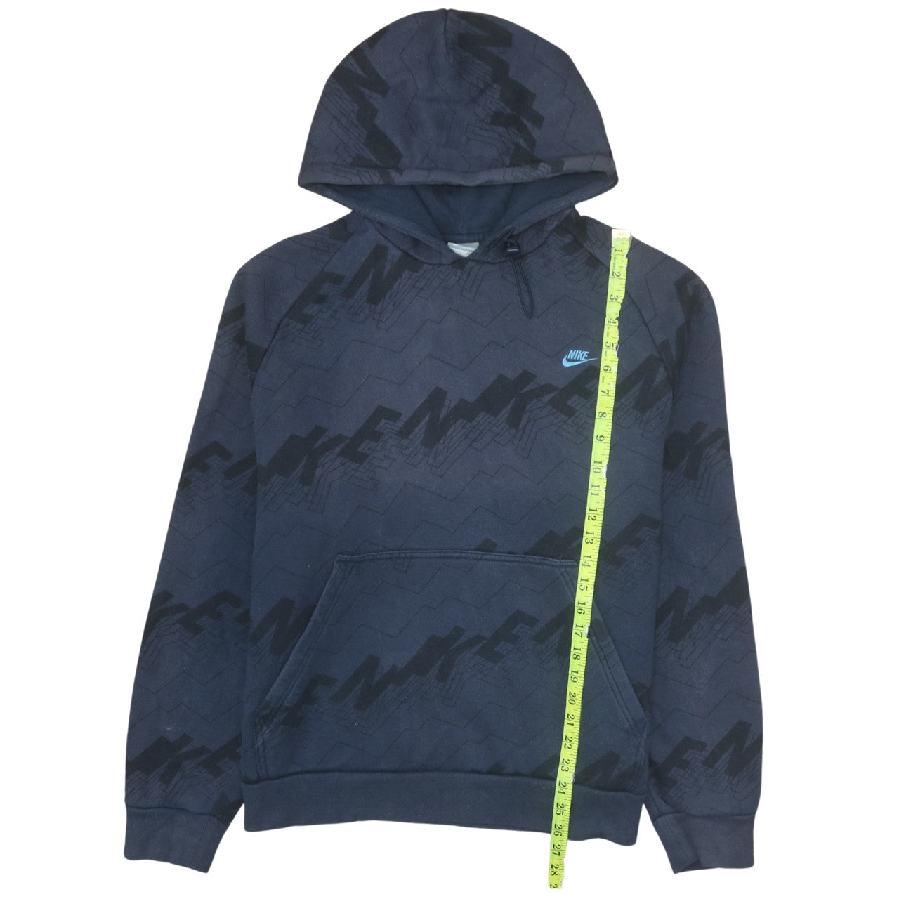 This Nike Men’s Blue Pullover Hoodie offers a timeless sporty look with unmatched comfort and quality. Crafted from a soft cotton and polyester fleece blend, it provides warmth and durability without compromising breathability, making it ideal for wear across autumn, winter, and spring seasons. Designed with a fixed drawstring hood and a classic kangaroo pocket, it combines style and practicality. The pullover hoodie features a regular fit with long sleeves and a crew neck for a relaxed, casual silhouette that suits everyday wear or athletic activities. The front displays Nike’s iconic logo accent and bold graphic print pattern throughout, giving it a distinctive and stylish edge for those who appreciate quality streetwear aesthetics. The ribbed cuffs and hem ensure a secure and comfortable fit that retains shape over time. This hoodie is perfect for gym sessions, jogging, or simply adding a sporty layer to your casual outfit, blending comfort and brand appeal effortlessly. Made in Malaysia, this fleece hoodie maintains high standards of craftsmanship and attention to detail associated with Nike’s trusted sportswear line. The navy blue tone makes it versatile and easy to coordinate with jeans, joggers, or shorts for relaxed off-duty style. In excellent pre-owned condition with only minor signs of gentle wear, it remains fresh and ready for a new wardrobe. Machine washable for easy care, it’s a reliable choice for year-round casual use. Whether you're updating your sportswear collection or looking for a dependable hoodie for layering, this Nike pullover offers comfort, durability, and classic brand appeal — a must-have for any fashion-conscious man who values effortless style and quality performance wear.