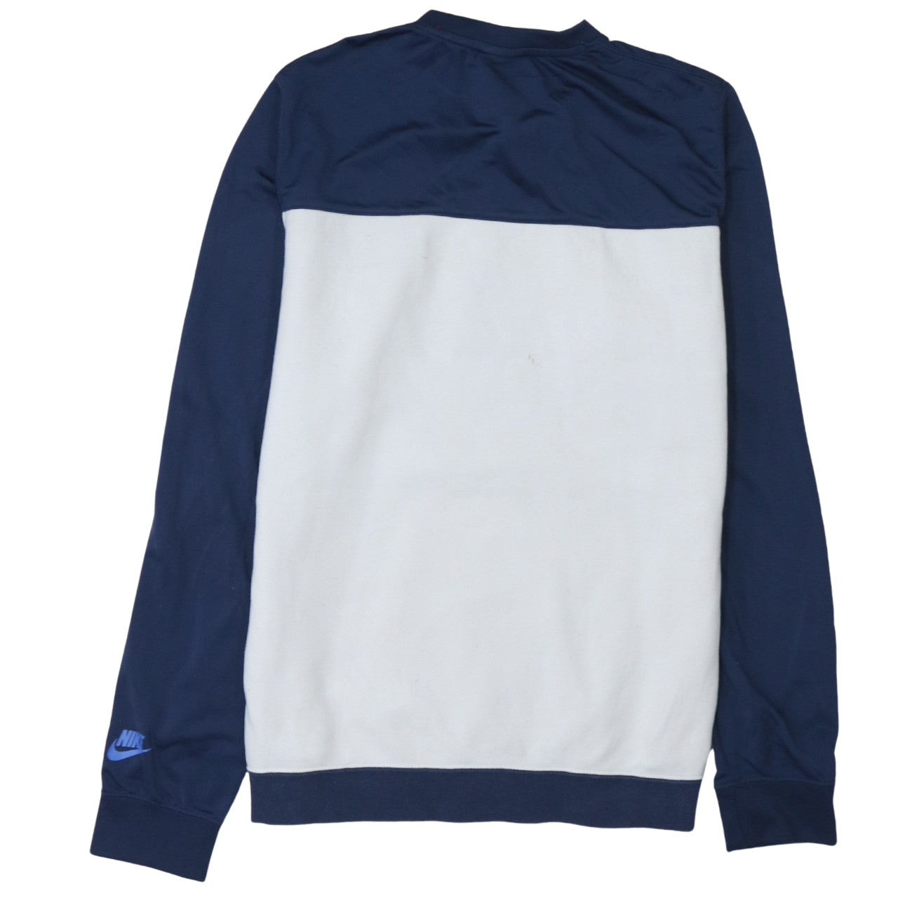 This Nike Men's Blue & White Pullover Sweatshirt combines sporty style with enduring comfort. Made from a soft fleece blend of 80% cotton and 20% polyester, this sweatshirt provides warmth and breathability, making it a perfect choice for cooler days. The bold Nike logo across the chest adds a distinct athletic flair, while the clean colour block design in deep navy and crisp white offers a versatile and modern look. The crew neck style enhances comfort and layering potential, making it ideal for casual wear, light training, or gym sessions. Designed with ribbed cuffs and hem, the relaxed fit ensures it sits comfortably on the body, maintaining its shape over time. Suitable for autumn, winter, and spring, this sweatshirt offers all-season wearability. The garment is machine washable for easy maintenance, and the soft fleece lining adds an extra touch of coziness. Although in very good used condition, it shows a minor mark on the lower front panel, barely noticeable and not detracting from its overall appeal. Ideal for men who appreciate classic Nike quality and sporty aesthetics, this pullover sweatshirt is a wardrobe essential that pairs effortlessly with jeans, joggers, or shorts. Whether you’re heading to the gym, running errands, or lounging at home, this Nike sweatshirt ensures you look sharp and feel comfortable. Its practical design and graphic detail make it a standout piece for a modern athletic look. Secure this stylish sweatshirt today and elevate your casual sportswear collection with an authentic touch of Nike performance and design.