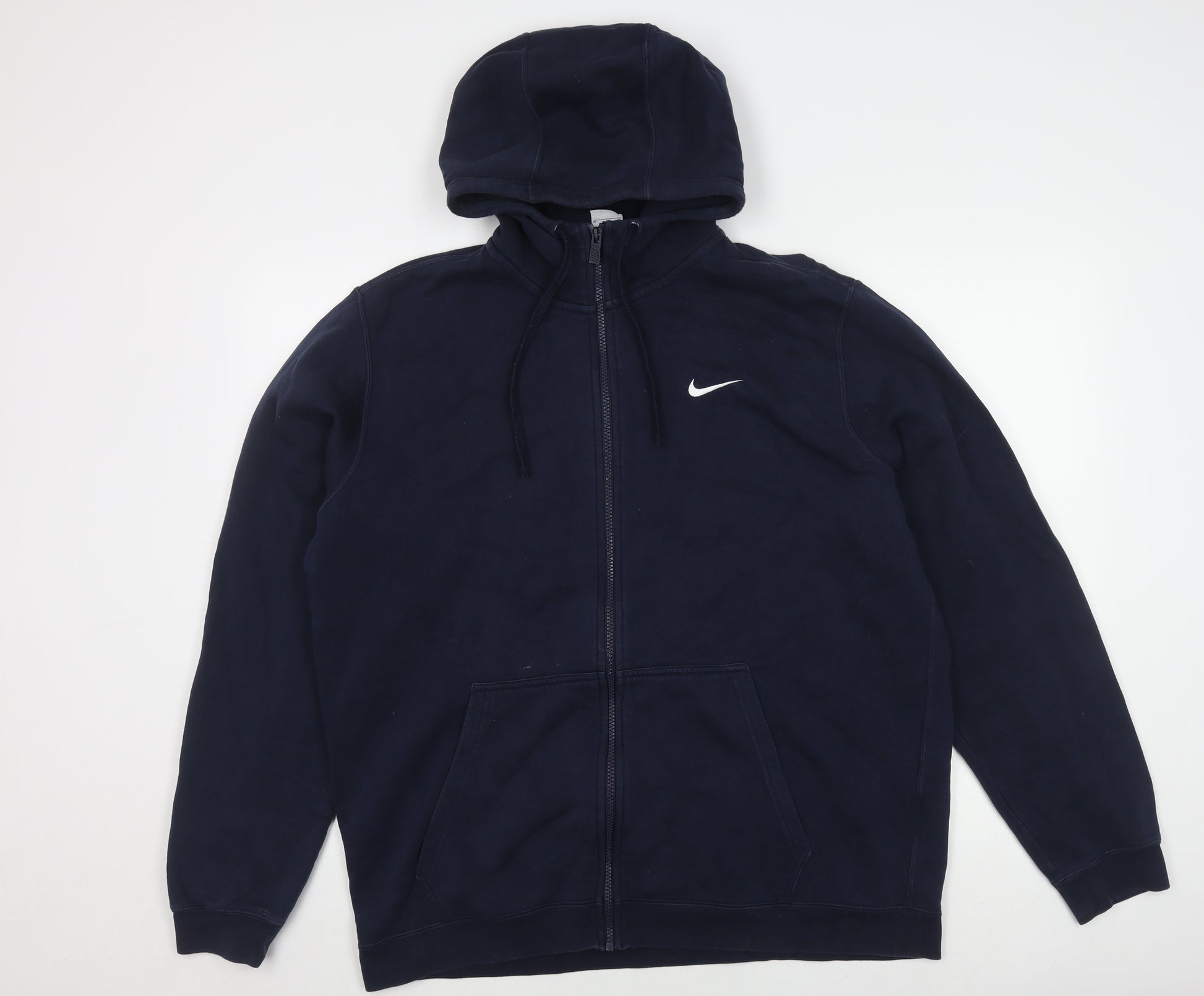 Elevate your casual wardrobe with this classic Nike men's jacket, perfect for the cooler months of autumn and winter. Crafted in a versatile blue shade, this jacket features a blend of soft cotton and durable polyester, providing comfort and style. The regular fit and mid-length design make it ideal for layering over your casual attire, whether you're heading out for a leisurely walk or running errands around town.The jacket includes convenient features such as a full zip closure and a hood, ensuring you stay protected against the elements. The logo accents add a touch of branded flair, while the kangaroo pockets offer practical storage for your essentials. Designed for casual occasions, this jacket is a reliable choice for everyday wear.Machine washable for effortless garment care, this Nike jacket combines fashion and function in one. Although showing slight signs of wear, it remains in excellent condition, ready to accompany you on your daily adventures. Discover the perfect balance of comfort and style with this must-have piece from Nike.