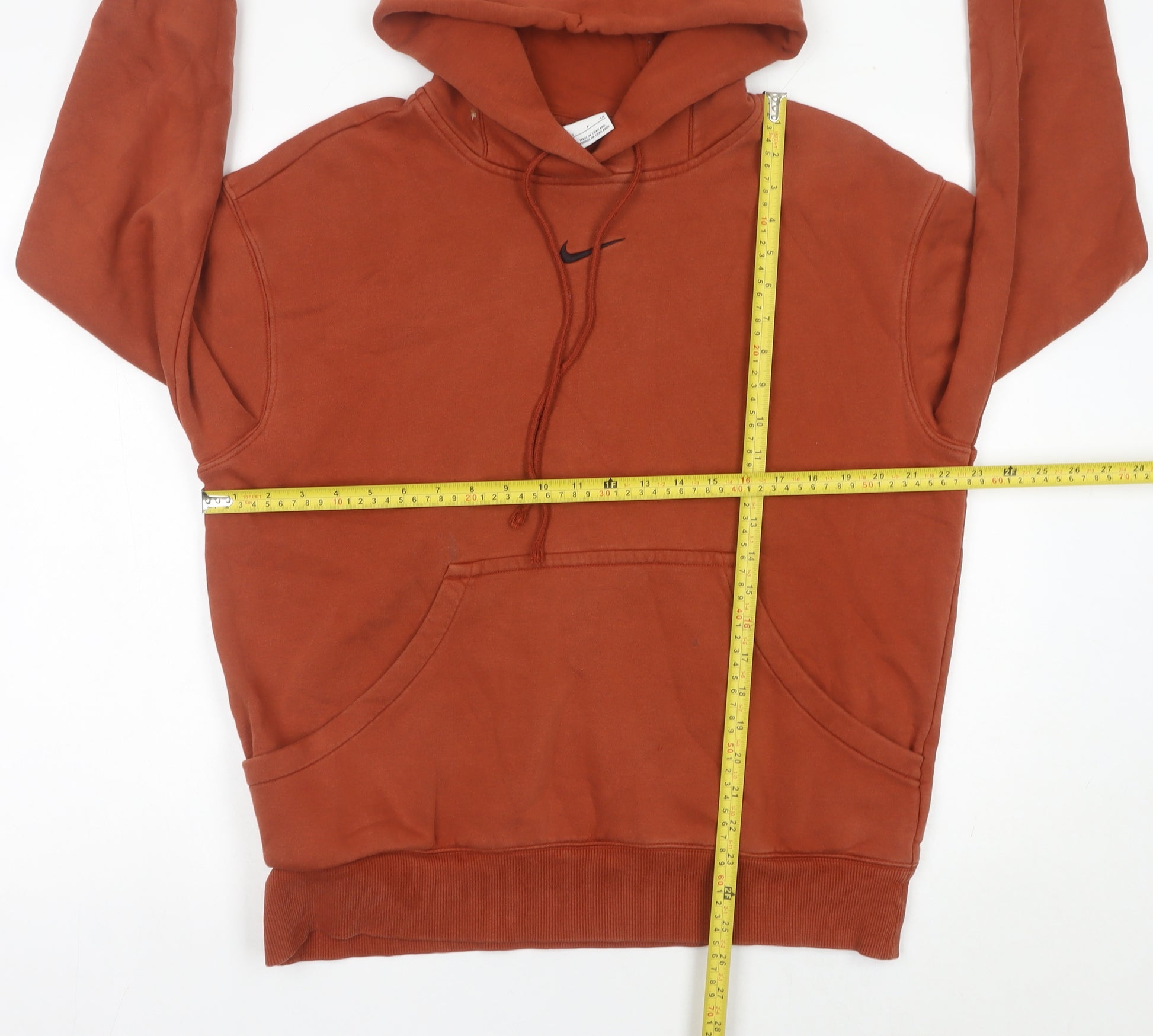 Elevate your casual wardrobe with this Nike Men's Pullover Hoodie in a rich brown shade, designed with both comfort and versatility in mind. Crafted from a premium fleece blend of 80% cotton and 20% polyester, this hoodie balances softness with lasting durability. The breathable cotton ensures it stays comfortable across all seasons, while the polyester adds structure and resilience for everyday wear. Featuring a relaxed regular fit and classic long sleeves, the hoodie includes ribbed cuffs and hem to secure warmth and offer a snug silhouette.The pullover design is complemented by an adjustable drawstring hood, making it practical for cooler weather and outdoor activities. A spacious kangaroo pocket offers both utility and style, perfect for keeping hands warm or holding essentials on the go. The understated swoosh logo accent sits neatly on the front chest, giving it that signature Nike branding without being flashy. With its solid brown tone, the hoodie avoids busy prints or patterns, creating a simple yet stylish look that can pair with jeans, joggers, or shorts effortlessly.Ideal for multiple performance and casual activities, this hoodie is perfect for the gym, football, running, jogging, or simply lounging in comfort. Its fleece-lined interior adds extra warmth for autumn, winter, and early spring wear, making it a dependable choice throughout much of the year. While pre-owned, it remains in good wearable condition with only light visible staining on the sleeve, which does not detract significantly from its style or wearability.A must-have staple for any active wardrobe, this Nike hoodie delivers all the essentials you’d expect from a trusted sportswear giant: durability, comfort, and understated branding. Whether you’re heading out for training or just want a laid-back look, this piece is a reliable and stylish pick. Don’t miss your chance to grab this versatile hoodie at excellent value.