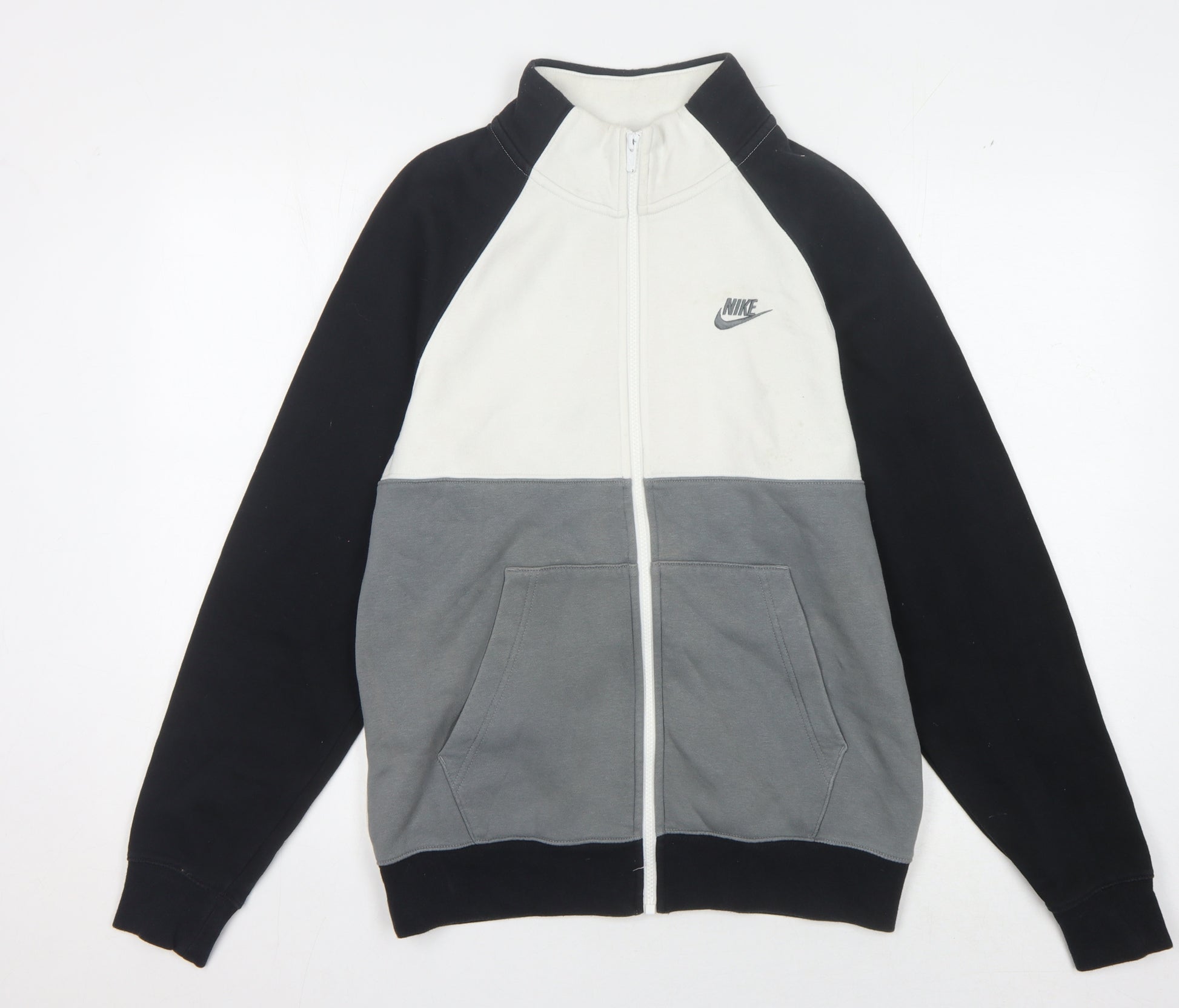 This Nike men's hoodie offers a stylish and comfortable option for your casual wardrobe. Featuring a sleek colour block design in black, grey, and white, it brings a modern twist to the classic full zip hoodie. Designed for the active man, it includes practical features like a high neckline and convenient pockets. The hoodie is made from a quality fleece fabric blend of 80% cotton and 20% polyester, ensuring warmth and durability for the autumn and winter seasons. Its long sleeves and regular fit make it ideal for layering over gym attire or casual outfits. While it's in excellent condition, minor wear and slight stains offer it a distinctive character, perfect for those who appreciate vintage vibes. A logo accent adds a touch of branded sophistication, making it suitable for both gym sessions and casual day outs. Machine washable for ease of care, this hoodie combines style, comfort, and functionality in one versatile piece.