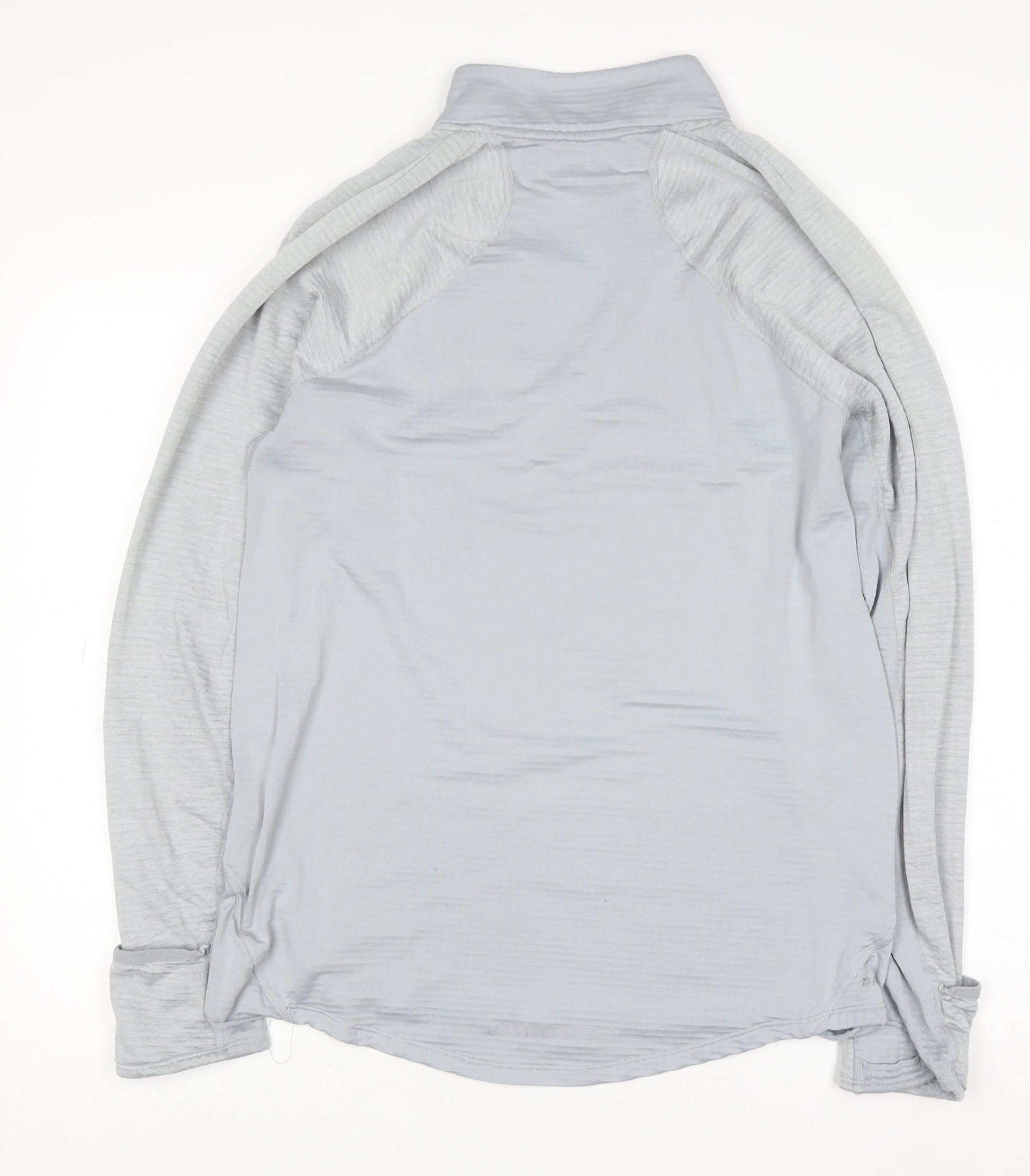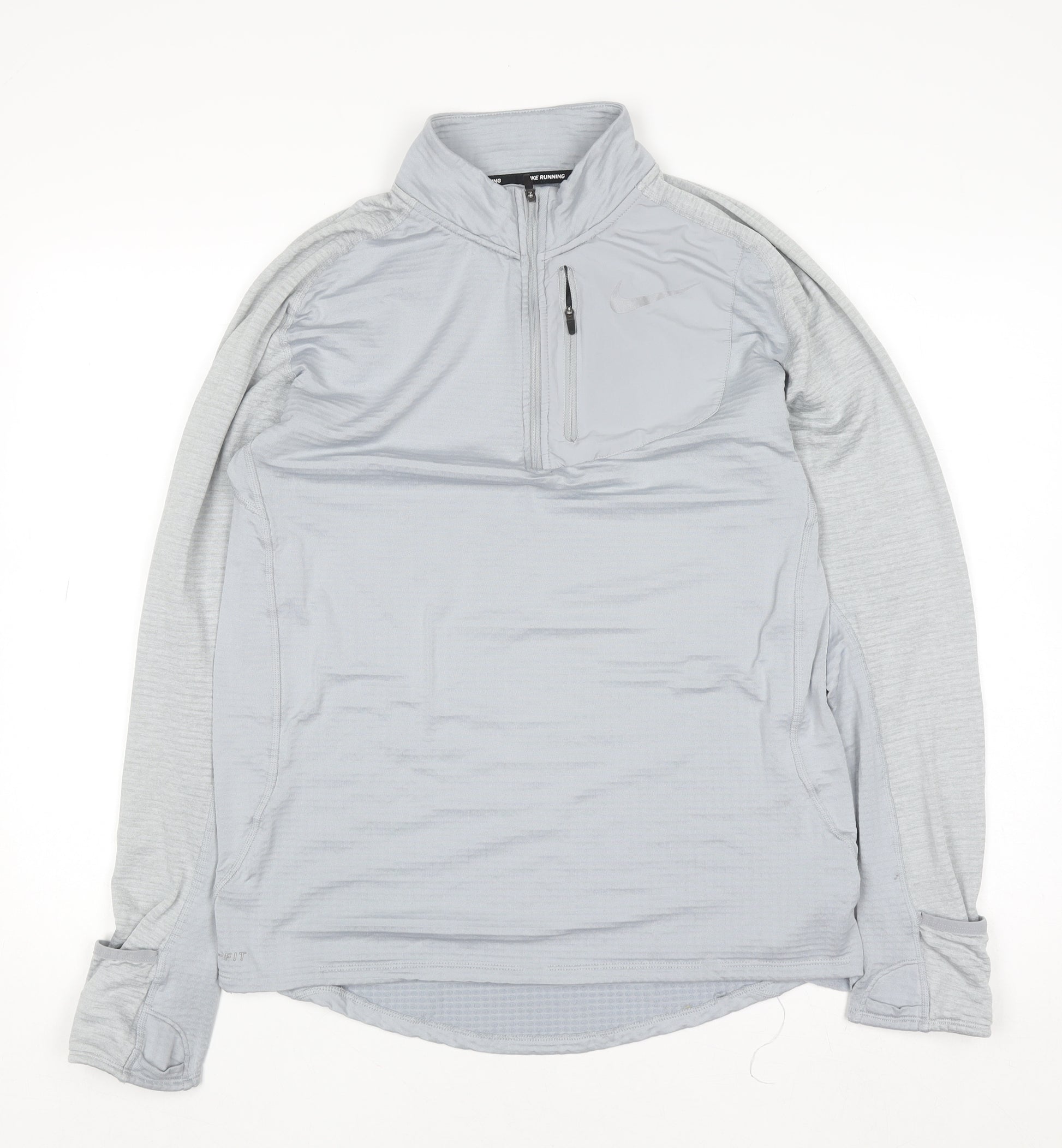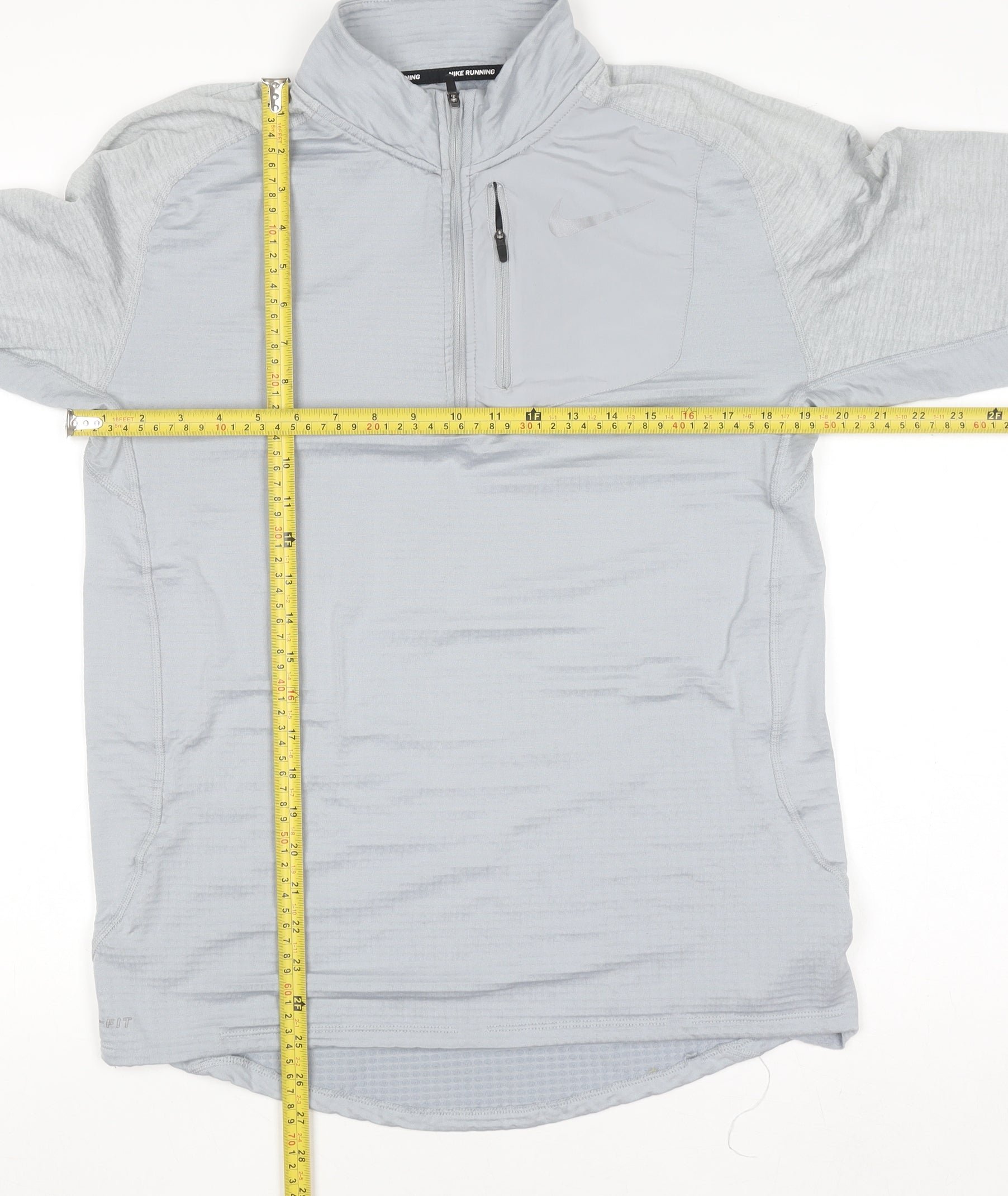 Stay comfortable and enhance your performance with this Nike Men's Grey Dri-FIT 1/4 Zip Running Top in size Medium. Designed with active individuals in mind, this lightweight pullover combines functionality and modern style to help you perform at your best during workouts, runs, or casual wear. The soft, stretchy Dri-FIT fabric efficiently wicks moisture away from the skin, keeping you dry and comfortable, even during intensive activity. The 1/4 zip design provides adjustable ventilation, ideal for quick aerobic changes or layering in cooler conditions. The sleek light grey tone adds a contemporary yet versatile aesthetic that pairs perfectly with any training gear. Featuring thumb holes for a secure fit and a discreet zippered chest pocket for safe small-item storage, this top balances form and practicality effortlessly. With a regular athletic fit that allows for freedom of movement without bulk, it’s perfect for running, gym training, or outdoor sports. Crafted from high-quality 93% polyester and 7% elastane, the material delivers durability, flexibility, and easy-care convenience. Reflective details enhance visibility in low light, making it excellent for early morning or evening runs. This Nike pullover is ideal year-round, especially during the autumn and spring training seasons. While gently used, it remains in excellent condition with no visible flaws—ready to help you power through every session in comfort and style. A dependable and stylish addition to any active wardrobe.