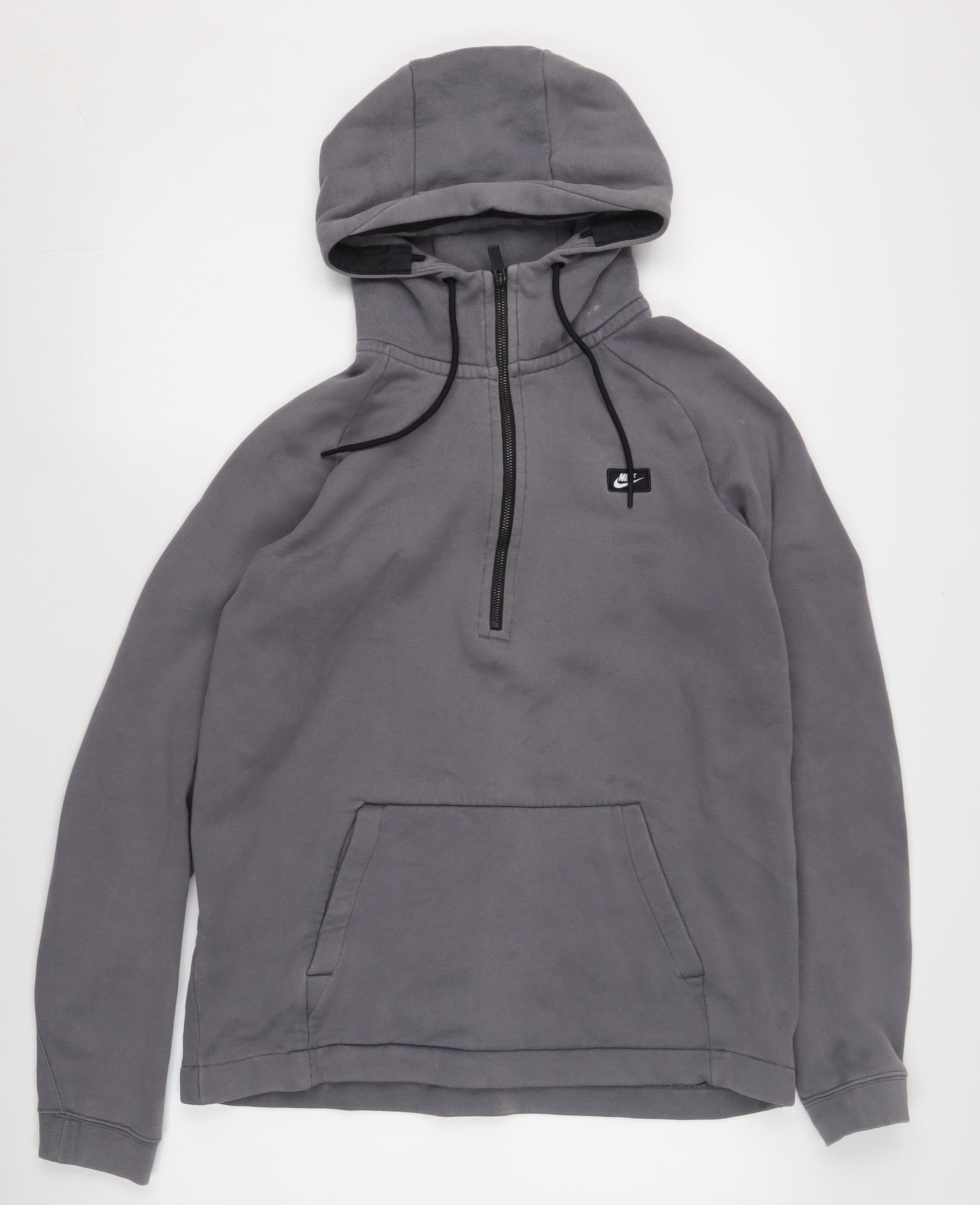 This Nike men's hoodie in a versatile grey shade is an ideal addition to your casual wardrobe. Designed with comfort in mind, its fleece fabric ensures warmth, making it perfect for chilly autumn and winter days. The hoodie features a practical 1/4 zip closure, coupled with convenient drawstrings to adjust the hood for a snug fit. Accented with the iconic Nike logo and additional zip details, this hoodie not only offers style but functionality with its front pockets, providing a handy place to keep your essentials. Constructed from an 82% cotton and 18% polyester blend, it ensures durability while retaining a soft feel. Though previously worn and with minor stains, it remains in good condition and retains its original shape and vibrant colour, offering value. Easy to maintain, it is machine washable, making it a practical choice for everyday wear. Its regular fit provides comfort for any body type, ensuring a relaxed experience whether at home or on the go. An indispensable piece for any season, this hoodie melds sportiness with style effortlessly, making it a staple for any men's wardrobe.