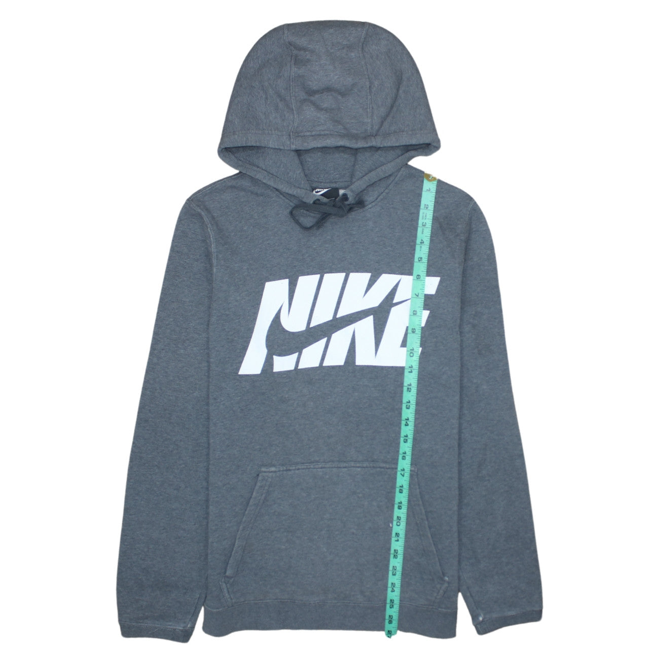 Step out in classic sporty style with this Nike men’s grey pullover hoodie, a wardrobe staple that brings comfort and everyday appeal. Made from a soft cotton and polyester fleece blend, this hoodie offers warmth and breathability, making it ideal for cooler days or post-workout wear. The bold white Nike logo printed across the chest adds a stand-out sporty look, reflecting Nike’s iconic athletic heritage. Designed for casual comfort, the hoodie features a drawstring hood for adjustable coverage and a cosy kangaroo pocket perfect for keeping hands warm or storing small essentials. The regular fit and crew neckline make it both comfortable and easy to layer over t-shirts or under jackets. The long sleeves and ribbed cuffs ensure a snug yet non-restrictive fit, maintaining shape even with frequent wear. Its fleece fabric interior offers a soft touch against the skin while keeping you comfortably warm through autumn, winter and early spring days. Perfect for gym sessions, casual weekends, or everyday errands, this Nike hoodie combines functionality with iconic streetwear style. Though in good used condition with a small mark and minor sleeve wear, it remains a stylish and quality piece ready to complement any casual outfit. Pair it with jeans, joggers, or shorts for a laid-back look that transitions effortlessly from workout to downtime. Trusted for comfort and timeless sportswear design, this hoodie embodies Nike’s reputation for durability and performance.