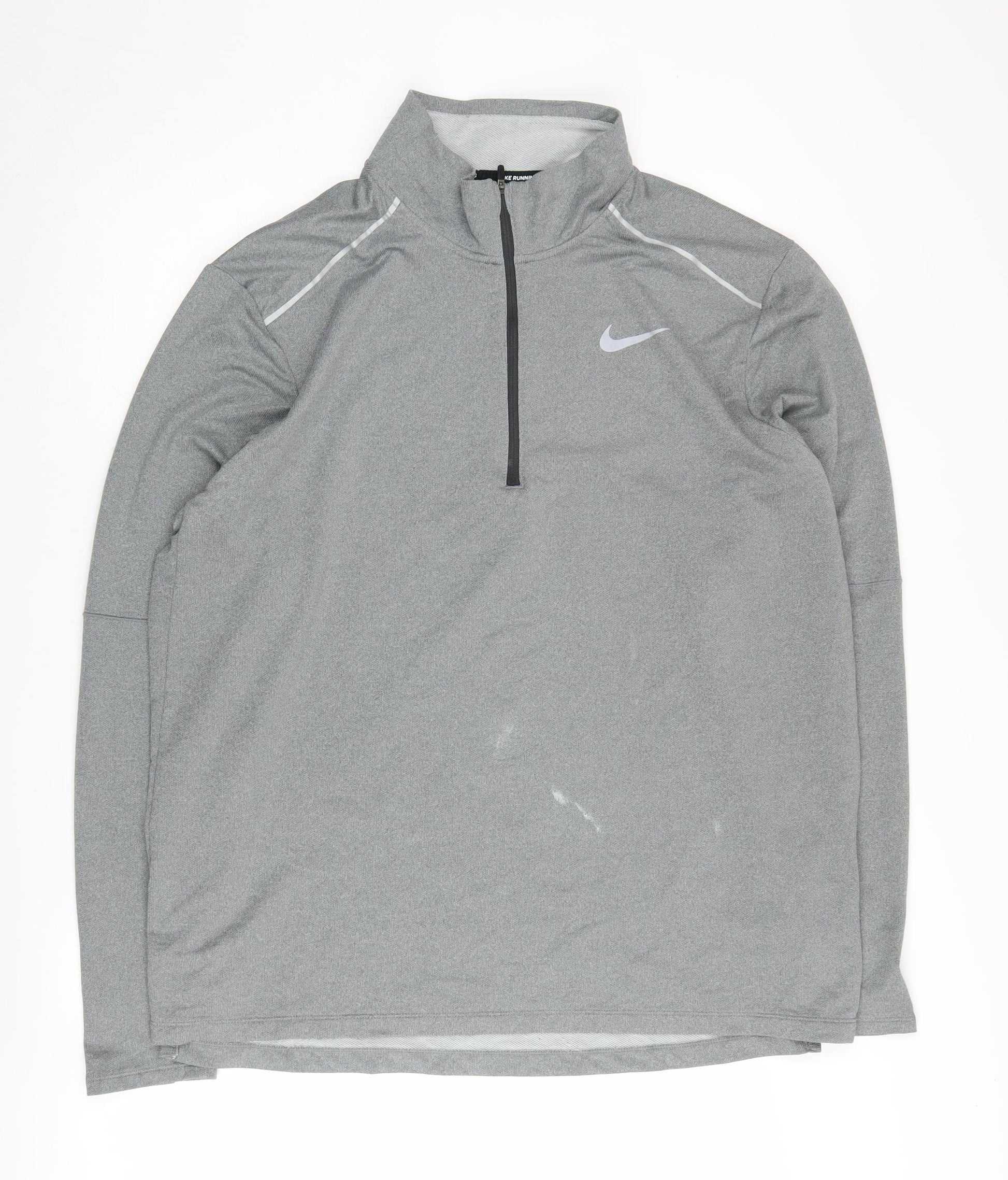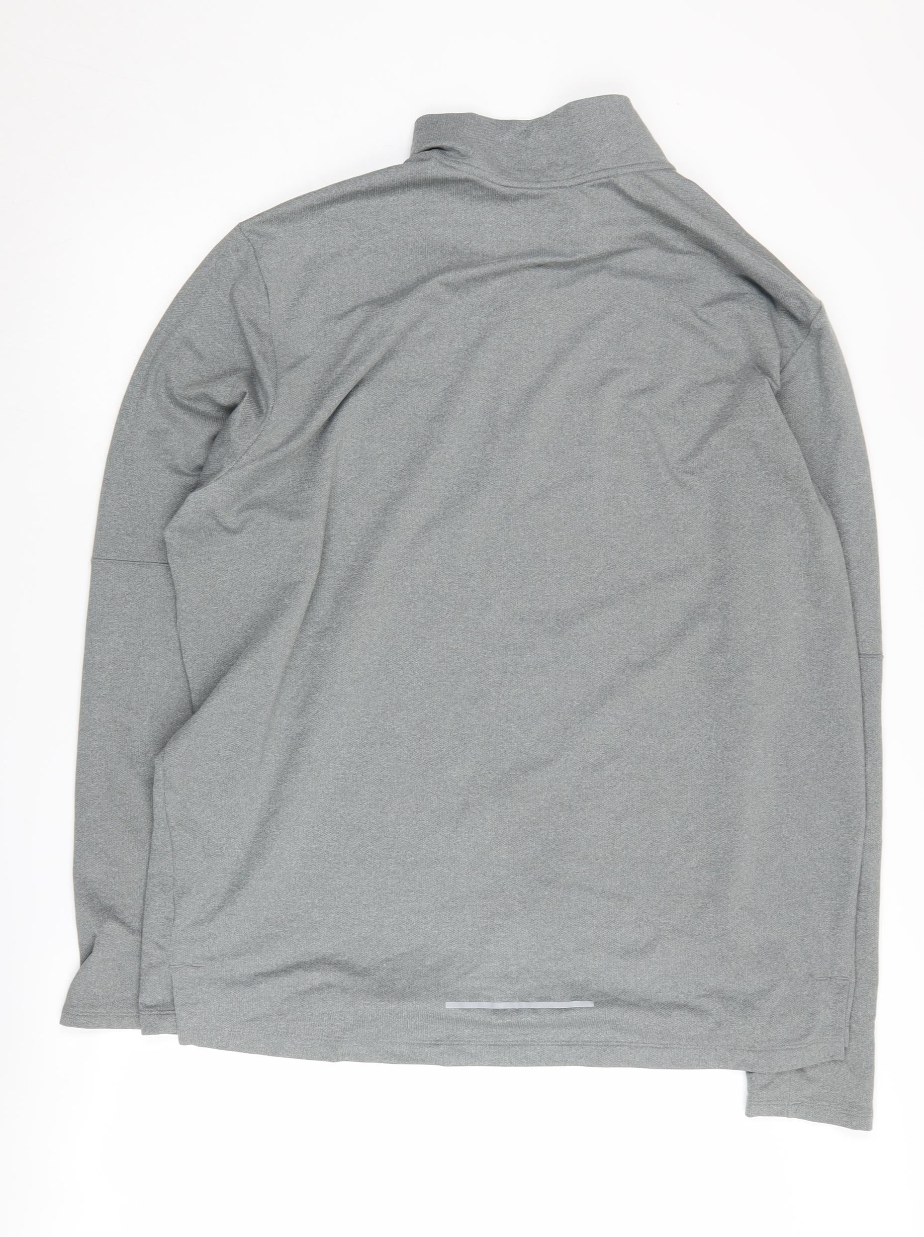 Introducing a sleek Nike Men's Running Pullover in a versatile grey shade, perfect for active lifestyle enthusiasts seeking comfort and style. This pullover, tailored in a regular fit, is specially designed for running and jogging. The long raglan sleeves ensure freedom of movement, enhancing your athletic performance. Crafted from a premium fabric blend of 86% Polyester and 14% Elastane, it boasts impressive moisture-wicking technology to keep you dry and comfortable, making it an ideal choice for intense workouts. Featuring a quarter zip closure for adjustable ventilation, this pullover allows you to stay cool during your dynamic sessions. Its mock neck lends a modern touch while providing added coverage in cooler temperatures. Despite having a minor mark on the front, the garment maintains an overall very good condition, ensuring resilient use and longevity. Embrace the iconic Nike logo accent on a solid pattern jersey fabric, highlighting sports-inspired sophistication. Machine washable for easy care, this pullover is engineered for all-season use, seamlessly transitioning between activities. Designed to enhance athletic performance, whether you’re hitting the track or the trails. Experience the unbeatable combination of functionality, durability, and style in this Nike Running Pullover, tailored for maximum comfort and efficiency on all your adventures.