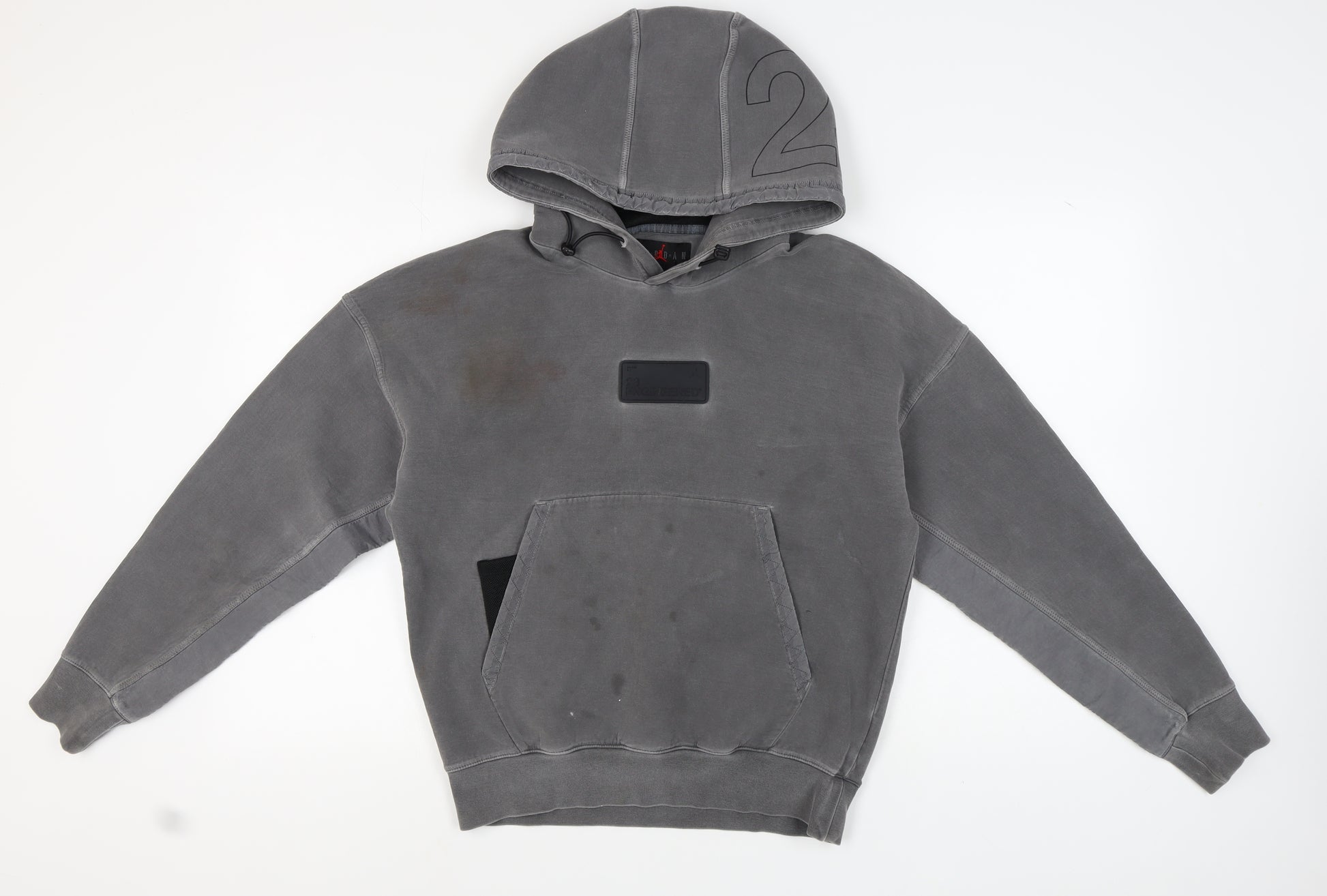 Embrace comfort and style with this Nike Men's Grey Hoodie. Designed in a classic pullover style, this hoodie is perfect for casual outings or laid-back days at home. It features a drawstring closure for an adjustable and snug fit, as well as a practical kangaroo pocket for convenient storage. Crafted from a durable blend of materials including 78% cotton, 18% polyester, and 4% spandex, this knit fabric ensures breathability and ease of movement. Its long sleeves provide warmth during cooler months, while the hood offers additional protection from the elements. Despite some visible stains, the hoodie remains in good condition, ready to become a staple in your wardrobe. Ideal for those looking for a reliable and comfortable everyday option.
