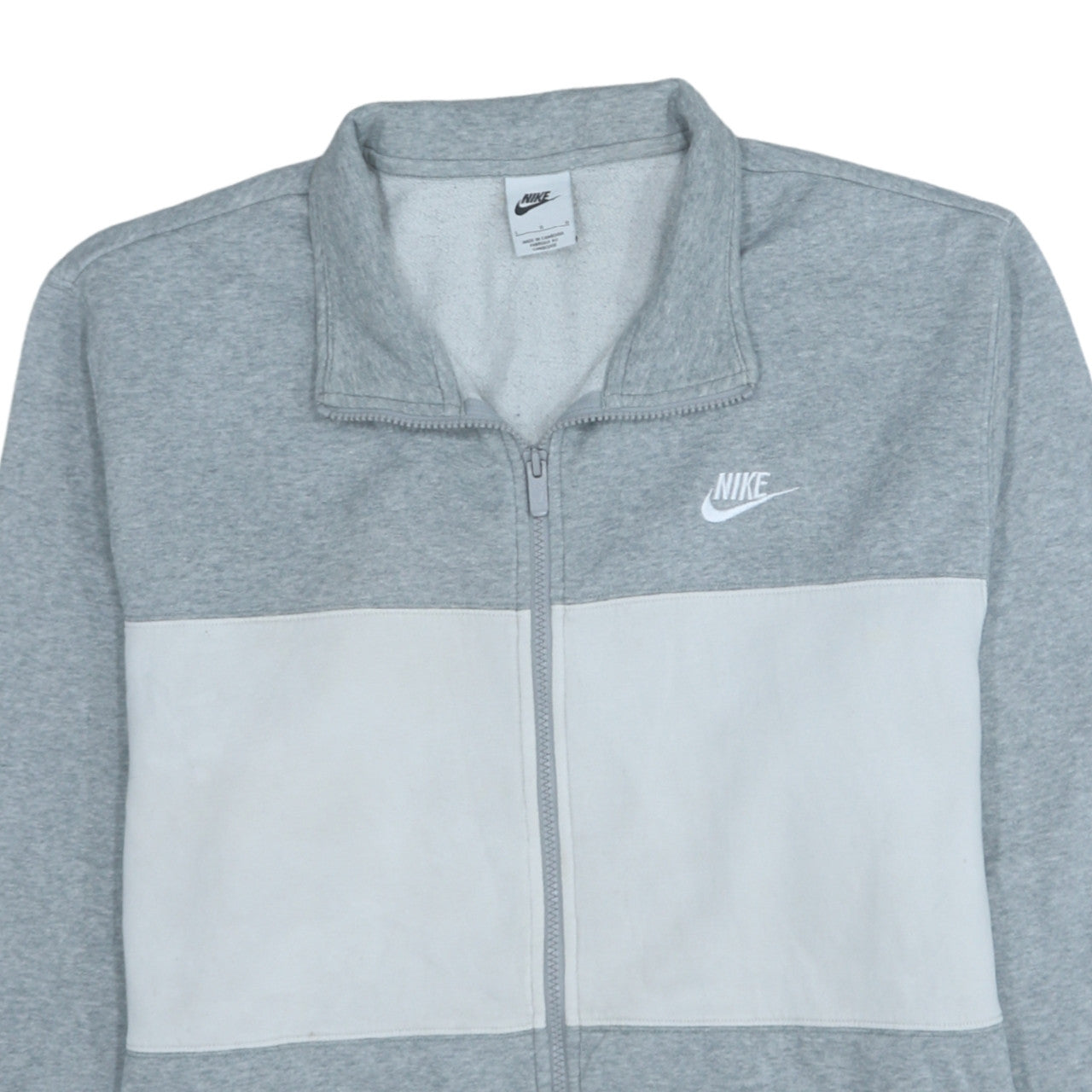 Upgrade your sporty style with this Nike men's grey track jacket, designed for active comfort and casual wear. Crafted from a soft blend of 80% cotton and 20% polyester, this jacket delivers a balance of breathability and warmth, making it ideal for workouts, weekend wear, or layering during the cooler seasons. The colourblock design in light and medium grey tones gives it a fresh, modern edge while maintaining that quintessential Nike athletic look. Featuring a full-zip closure with a stand-up collar, this jacket offers practicality and versatility, allowing you to adjust for comfort whether you’re training, running, or relaxing. The interior fleece lining enhances softness and warmth, while the ribbed cuffs and hem ensure a secure, comfortable fit. Designed in a regular fit size large (chest 110 cm), this jacket provides unrestricted movement without feeling bulky. With functional features including side pockets for your essentials and a breathable structured design, it’s perfectly suited for gym sessions, running errands, or light outdoor activities. The iconic Nike logo embroidered on the chest adds a signature finishing touch that instantly elevates the overall aesthetic. Machine washable for easy care, this activewear essential is built to handle everyday wear while maintaining its shape and quality. Classified in very good condition, this pre-owned item shows minor evidence of wear with a small mark on the lower front, but remains fresh and clean with plenty of life left. A versatile staple for the wardrobe of any sportswear enthusiast, this Nike track jacket blends style, comfort, and functionality seamlessly. Ideal for layering through autumn, winter, and spring, it’s as practical as it is effortlessly stylish — ready to keep up with your active lifestyle or complete your casual look in an instant.