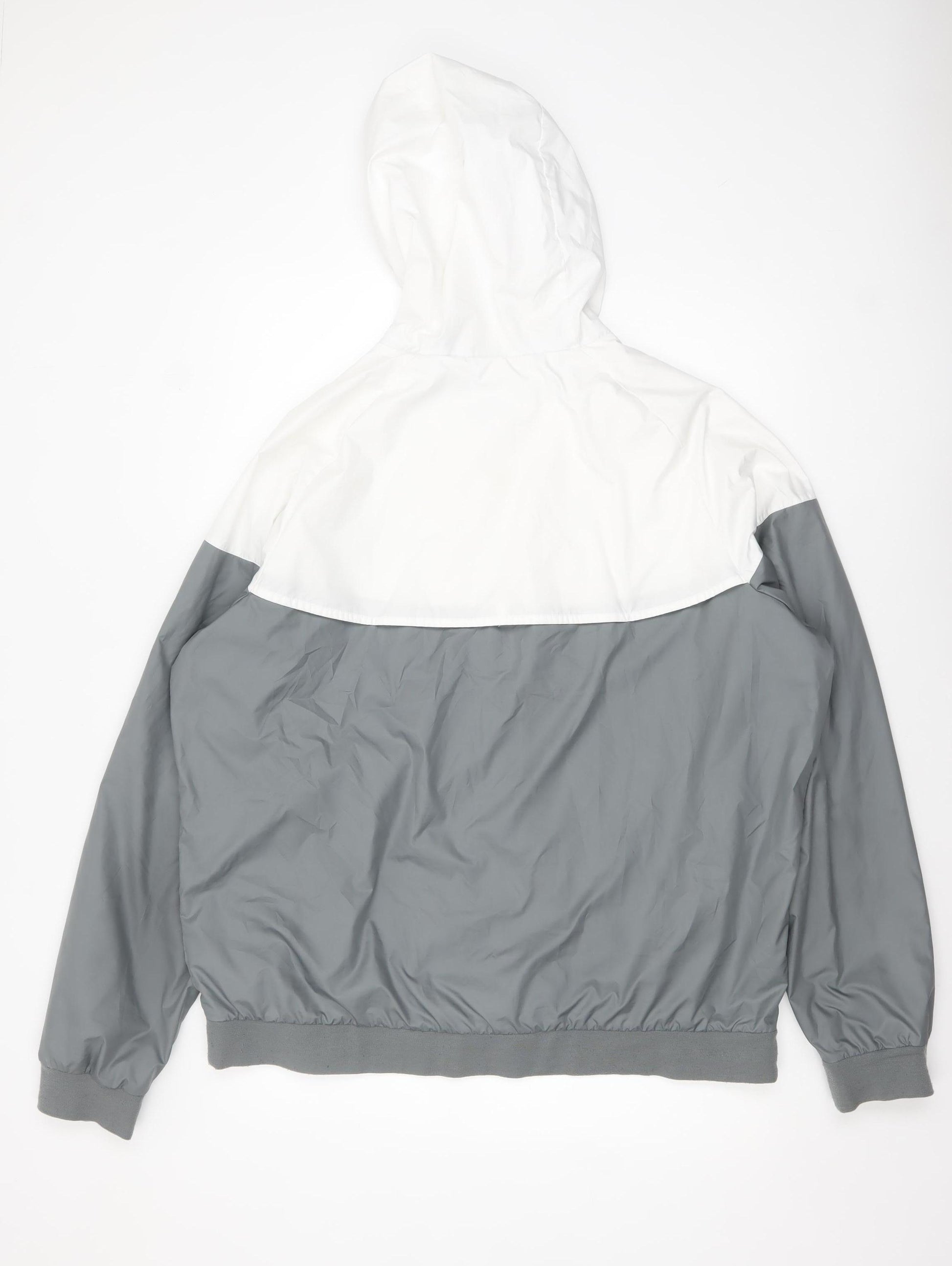 Upgrade your casual wardrobe with this smart, sporty Nike Men's Windbreaker Jacket in size XL. Designed for both comfort and practicality, this jacket combines a sleek grey and white colour block design with the classic Nike logo to deliver a clean, modern look. Crafted from 100% polyester, it features a lightweight shell that is both water resistant and windproof, ensuring you're protected from the elements without compromising on breathability. The full zip fastening allows for easy layering, while the adjustable hood and elasticated cuffs provide a snug fit to keep out the wind. Two zipped side pockets offer secure storage for your essentials, perfect for running errands, hitting the gym, or heading out for a jog. The mesh polyester lining enhances comfort, making this jacket ideal for active lifestyles in cooler spring and autumn weather. Its Regular fit offers easy movement, while the simple design ensures it pairs seamlessly with jeans or sportswear for casual or performance use. Whether you're walking, cycling, or training, this Nike jacket delivers both function and style. In excellent pre-owned condition with only minimal signs of wear, this high-quality windbreaker maintains its premium feel and durability. The lightweight and packable construction make it ideal for everyday wear or travel. Perfect for men who appreciate sporty design, reliable performance, and timeless streetwear appeal, this jacket is a wardrobe essential for all seasons. Grab this stylish, versatile windbreaker today to add a touch of athletic prestige to your outerwear collection.