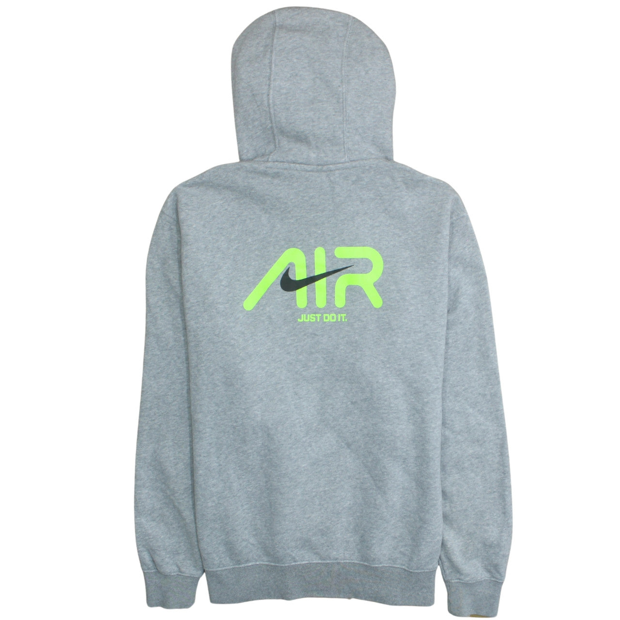 Step into comfort and iconic style with this Nike Men's Grey Pullover Hoodie in size XL. Crafted from a premium blend of cotton and polyester, this fleece-lined hoodie provides excellent warmth for cooler days while maintaining breathability for everyday wear. The soft interior ensures next-level comfort, making it an ideal choice for lounging, training, or layering up outdoors. The hoodie boasts a striking neon green and black Nike Swoosh logo on the chest and a bold 'AIR' graphic on the back, giving it a sporty edge that stands out everywhere you go. Featuring a drawstring hood, kangaroo front pocket, and ribbed cuffs and hem, it combines practicality with athletic design. The regular fit ensures easy mobility, and the smooth pullover style keeps it effortlessly casual. Perfect for men who value both performance and streetwear appeal, this piece transitions seamlessly from gym sessions to laid-back weekends. Designed for all seasons, it’s versatile enough for autumn mornings, winter chill, and spring outings. Machine washable for easy care, it retains its shape and quality wash after wash. In excellent preloved condition with light wear only, this hoodie comes from a trusted sportswear name known worldwide for quality and innovation. Whether paired with joggers, jeans, or shorts, it offers that effortlessly sporty and stylish Nike look. Ideal for gym, running, football, and casual activities, this is an essential addition to your wardrobe. Add an athletic touch to your everyday attire and show off your sporty side with this stylish and comfortable Nike XL Pullover Hoodie.