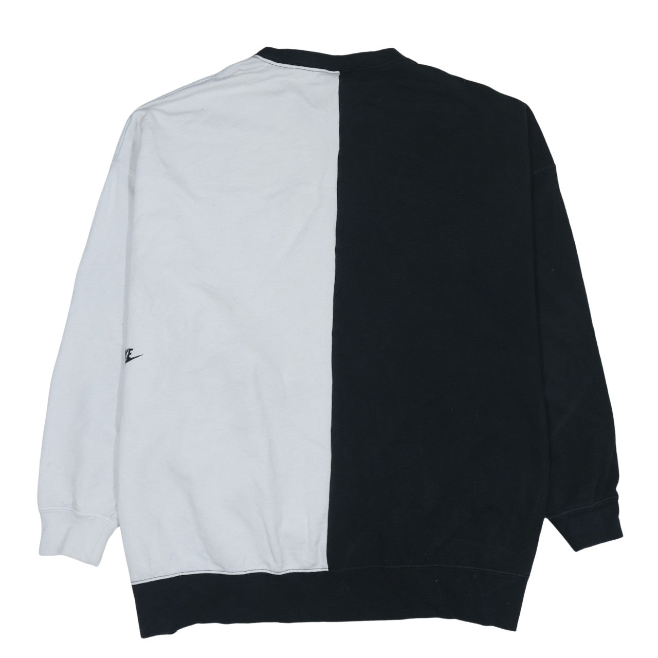 Step up your casual wardrobe with this bold Nike men's sweatshirt, designed to offer both comfort and standout street style. Crafted from a soft jersey fabric blend of 80% cotton and 20% polyester, this pullover provides a breathable and lightweight feel while maintaining just enough warmth for cooler days. The design features an eye-catching half black and half white split look with the iconic Nike logo boldly printed across the chest, giving it a distinctly modern and sporty touch.The sweatshirt is a medium size, built for a regular fit that flatters without being restrictive — perfect for both training sessions and everyday wear. With its crew neckline and long sleeves, it offers a classic silhouette that pairs effortlessly with jeans, joggers, or shorts. The cotton-rich fabric ensures durability and ease of care, while the polyester adds flexibility and shape retention over time. The lightweight construction and soft texture make it suitable for autumn, winter, and spring seasons.Ideal for men who value both comfort and active design, this Nike sweatshirt works equally well for gym sessions, casual outings, or lounging at home. The graphic print and colour-blocked styling lend a fashionable edge, while the premium build and stitching highlight Nike’s reputation for quality and durability. Although gently used, the sweatshirt remains in very good condition with only light signs of wear. It has been machine washed and handled with care to maintain its shape and colour integrity. If you’re after a versatile piece that blends iconic branding with everyday comfort, this Nike sweatshirt is a must-have addition to your wardrobe — perfect for sporty, active, or laid-back looks alike.