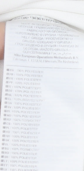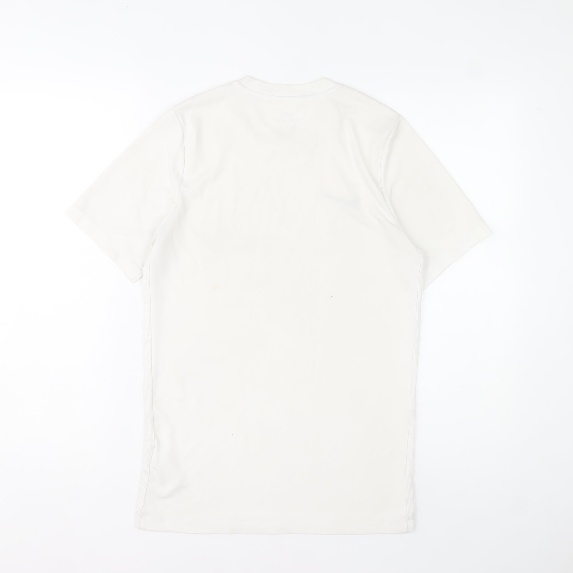 Stay cool and comfortable during your workouts with this premium Nike Men's White Dri-Fit T-Shirt in size Small. Designed with performance and reliability in mind, this athletic top is crafted entirely from lightweight 100% polyester, offering breathable and quick-drying qualities ideal for a variety of sports and training sessions. The moisture-wicking Dri-Fit technology ensures sweat is drawn away from your body, helping you stay fresh no matter how intense your activity gets. Styled in an understated solid white finish and accented by the iconic Nike swoosh logo on the chest, it’s a timeless piece that brings both function and style to your gym or casual wardrobe. The athletic fit enhances mobility while providing a streamlined look that flatters the physique, making it ideal for running, gym & training, and football sessions. Its comfortable crew neckline and short sleeves ensure ease of movement. Machine washable for easy care, this Nike T-shirt delivers durability and practicality for everyday athletic wear. With its simple yet modern appeal, this top fits seamlessly into any activewear collection and pairs effortlessly with joggers, shorts, or track pants. Despite light faint marks visible under close inspection, it remains in very good condition and ready for more workouts or casual use. Affordable, functional, and stylish, this Nike Dri-Fit tee is a reliable choice for athletes and enthusiasts who value comfort and quality performance wear. Whether you're lifting in the gym, jogging outdoors, or taking part in a friendly game on the pitch, this versatile white T-shirt offers the breathability, flexibility, and comfort you need to perform your best.
