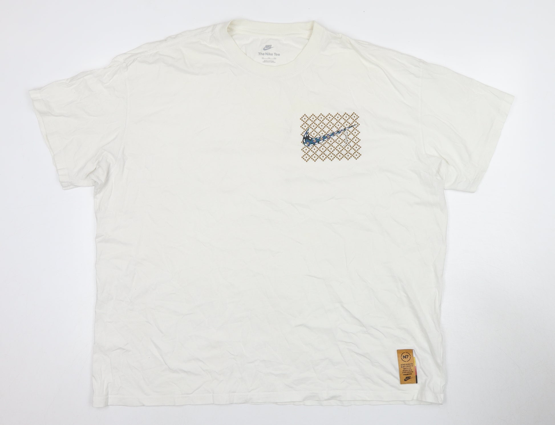 Elevate your casual wardrobe with this Nike men's T-shirt, featuring a crisp white hue and adorned with the iconic Nike logo. This T-shirt is crafted from 100% cotton, ensuring a soft and breathable experience for all-day wear. Perfect for any season, the classic design with a crew neck and short sleeves makes it a versatile piece for any outfit. Designed for the modern man, it comes in a comfortable XXL size, providing a regular fit. Whether you're heading to the gym or out for a casual day, this T-shirt is sure to keep you looking stylish and comfortable. A perfect blend of comfort and brand appeal, this Nike T-shirt is an essential addition to your collection. Don't miss out on the opportunity to own a piece of this timeless sportswear brand at a great price!