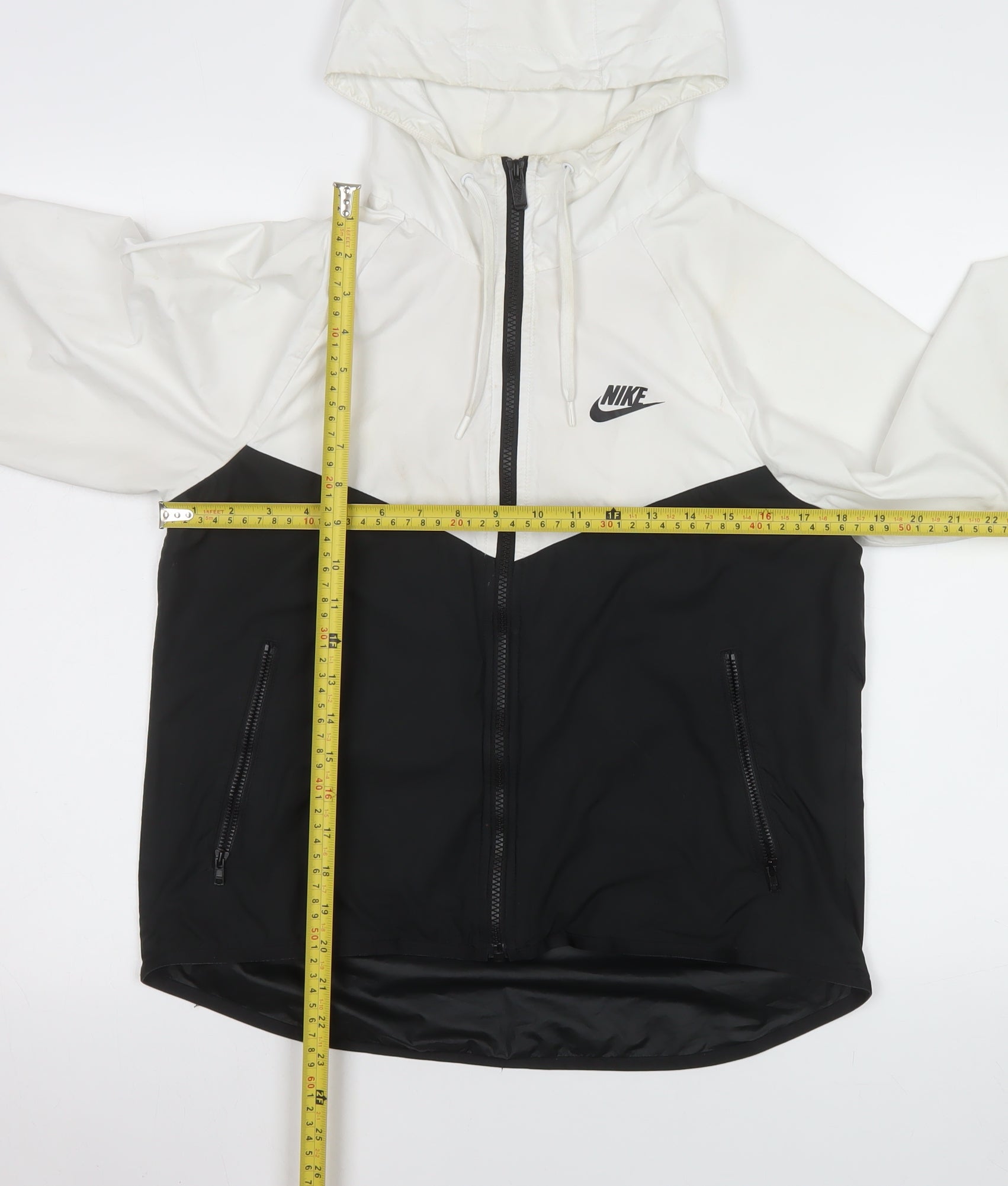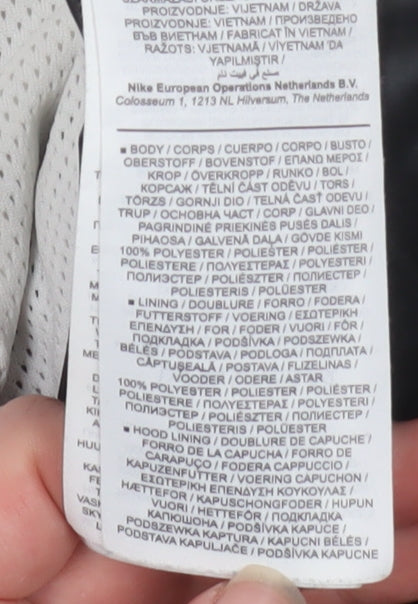 Stay comfortable and stylish whatever the weather with this Nike Men's black and white windbreaker jacket. Crafted entirely from durable, lightweight polyester, the jacket offers breathable wear that’s perfect for transitional seasons like spring and autumn. The full front zip closure makes it easy to take on and off, while the adjustable hood provides extra protection against wind or light rain. The sleek two-tone design—black body contrasted with white sleeves and hood—gives it a modern, sporty aesthetic that pairs easily with jeans, joggers, or training gear. Featuring two practical zipped pockets at the front to keep small essentials secure and accessible, this jacket is ideal for running, walking, or casual everyday wear. The comfortable mesh lining helps regulate temperature, making it a versatile choice for active and relaxed lifestyles alike. Styled with Nike’s iconic swoosh logo embroidered on the chest, it embodies timeless sportswear appeal with quality craftsmanship. Despite some light marks on the sleeve cuffs, the jacket remains in very good condition with plenty of life left—perfect for anyone wanting a functional yet fashionable outer layer. Whether you're heading to the gym, going for a jog, or simply stepping out in casual style, this Nike Men's Windbreaker is a reliable wardrobe essential that combines comfort, practicality, and classic streetwear design. A must-have piece for any contemporary wardrobe looking for versatility and performance without compromising on style.