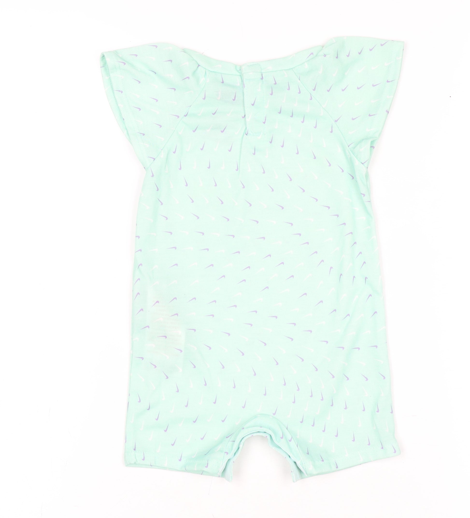 Keep your little one cool, comfortable and stylish in this adorable Nike unisex baby romper. Made from 100% polyester, this lightweight one-piece features a mint green base with all-over swoosh logo accents in a playful lavender print, showcasing classic Nike design cues. Perfect for active babies, the romper is crafted with breathable woven fabric for comfort and ease of movement. Designed for convenience, it includes a round neckline, short sleeves that allow for effortless play, and a rear snap closure for quick changes. The soft, airy fabric ensures your baby stays comfortable during the warmer months, making it an excellent choice for summer wear. The sporty theme and signature Nike logo give it an instantly recognisable look that’s both trendy and functional. Ideal for casual outings, playdates, or lounging at home, this romper matches Nike’s reputation for quality and performance, adapted perfectly for little ones. With no original tags present but in excellent used condition with no visible marks or damage, this piece is ready for its next adventure and makes a great addition to any baby’s wardrobe. Pair it with soft booties or baby trainers for a complete athletic-inspired outfit. A dependable everyday essential, this playsuit perfectly balances classic Nike style with comfort and practicality. Whether your baby is crawling, playing or exploring, they’ll do it in sporty style and complete comfort. A must-have for parents seeking a blend of fashion and function in babywear.