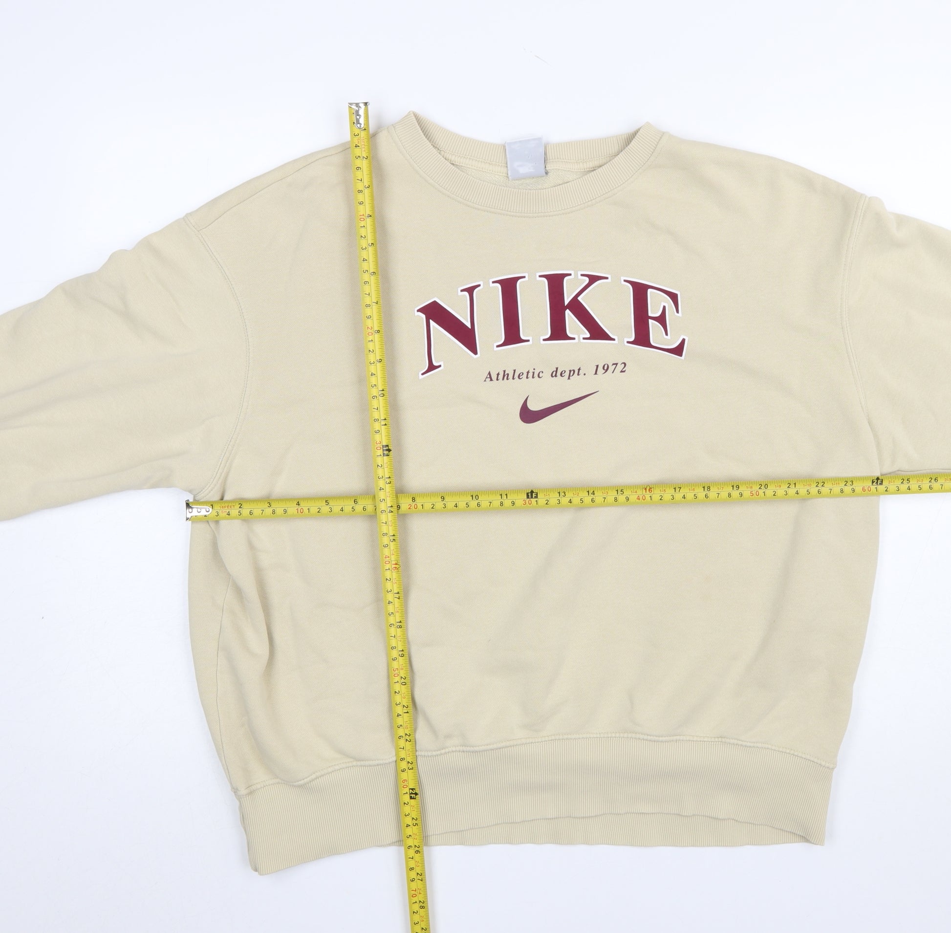 Elevate your casual wardrobe with this beige Nike women's sweatshirt, designed for style, comfort, and timeless appeal. Crafted from a soft cotton and polyester blend, this fleece sweatshirt provides a warm and lightweight feel, ideal for all-season wear. The regular fit and crew neck design make it versatile and comfortable, perfect for relaxed days, trips to the gym, or casual outings. The soft ribbed cuffs and hem ensure a flattering shape and lasting durability.The front features Nike’s bold logo with 'Athletic Dept. 1972' printed across the chest, delivering a clean, sporty look that embodies the classic Nike aesthetic. The neutral beige colour pairs effortlessly with any outfit, whether you layer it over jeans or active leggings. The lightweight fleece interior offers breathable warmth for those cool autumn or spring days, while the fabric’s smooth exterior maintains a premium, polished finish.Made in Turkey, this Nike pullover sweatshirt is a reliable staple for your wardrobe. The high-quality materials are both soft and resilient, maintaining their shape even after multiple washes. The absence of visible wear, stains, or damage ensures an excellent pre-owned condition, ready for immediate wear.This Nike crew neck jumper is ideal for an active and casual lifestyle, offering comfort, warmth, and brand-defining style that easily transitions from the gym to everyday wear. Whether you’re lounging at home, heading to a weekend meet-up, or taking a brisk walk outdoors, this piece provides effortless comfort and classic athletic heritage. Add this stylish beige Nike sweatshirt to your collection for a perfect blend of simplicity and sporty sophistication.