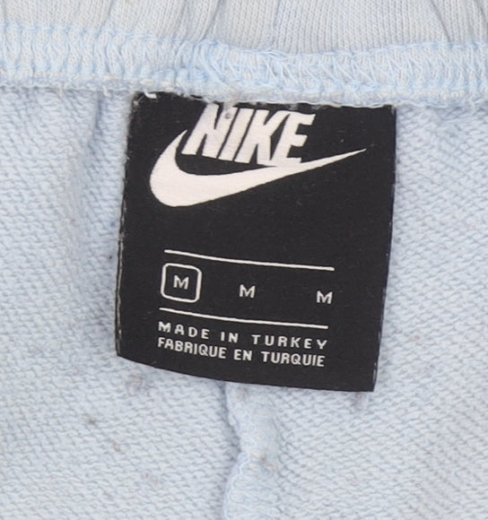 These Nike Women’s Jogger Trousers in a soft light blue tone combine comfort, practicality, and understated sporty style. Crafted from a quality blend of 80% cotton and 20% polyester, the jersey fabric feels breathable and smooth against the skin while offering flexibility for daily wear. The medium size and regular fit design ensure ease of movement, making these joggers perfect for casual outings, lounging, or low-impact activities. Featuring a comfortable elasticated waistband and elastic cuffs, these trousers offer a relaxed, secure feel that flatters while maintaining a laid-back silhouette. They also include functional side pockets ideal for essentials when on the go. The classic Nike logo accent in subtle gold adds a touch of brand identity and sporty energy without overpowering the minimalist look. Designed with tapered legs, the style provides a neat, modern shape suitable for pairing with trainers or casual footwear. The mid-rise waist enhances comfort and ensures a naturally flattering fit. Made in Turkey, the trousers showcase Nike’s consistent attention to quality and workmanship. These joggers are practical for everyday wear during autumn, spring, or cooler summer days, delivering both warmth and breathability. Although in good pre-owned condition, minor light stains can be seen on inspection, reflected in the price. They remain an excellent choice for anyone seeking branded comfort wear with timeless appeal. Perfect for daily errands, relaxing at home, or comfortable travel attire, the Nike Blue Jogger Trousers offer a balance between sporty authenticity and effortless casual fashion. Their durability, soft fabric composition, and easy-care design make them a must-have wardrobe staple for anyone valuing both comfort and style in equal measure.