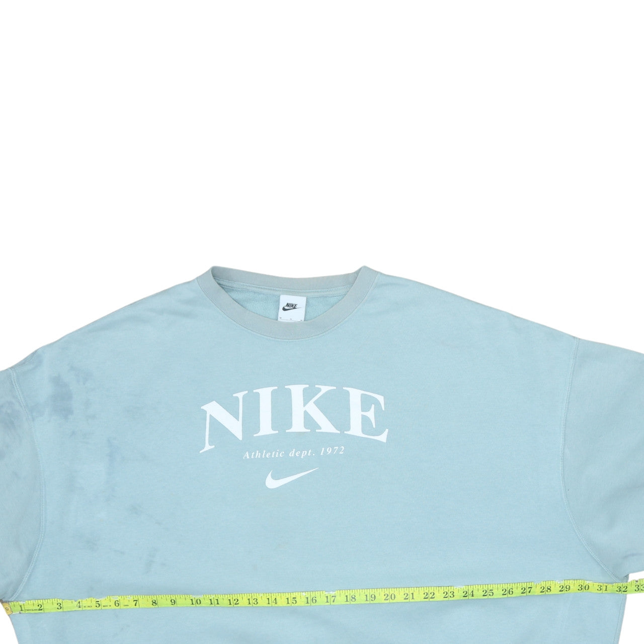 Add a touch of sporty style to your casual wardrobe with this Nike Women’s Pullover Sweatshirt in a soft pastel blue shade. Designed with comfort and timeless appeal in mind, this sweatshirt features a bold white Nike logo print across the chest with the classic 'Athletic Dept. 1972' detail, giving it a vintage-inspired, athleisure look. Crafted from a quality cotton and polyester blend, it offers both breathability and durability, making it ideal for layering or wearing on its own through all seasons. The round crew neckline, ribbed cuffs, and hem ensure a snug yet relaxed fit, while the soft brushed interior adds an extra layer of warmth and comfort. Perfect for laid-back weekends, gym sessions, travel, or just lounging at home, this sweatshirt complements jeans, leggings, or casual joggers effortlessly. This Medium size offers a relaxed, easy-going fit suitable for women who enjoy a classic silhouette. Despite some faint marks from gentle prior wear, the overall presentation remains excellent, ready to become a go-to favourite in your collection. Nike’s signature minimalist design and iconic branding ensure this piece remains a staple for anyone who loves combining athletic style with everyday comfort.