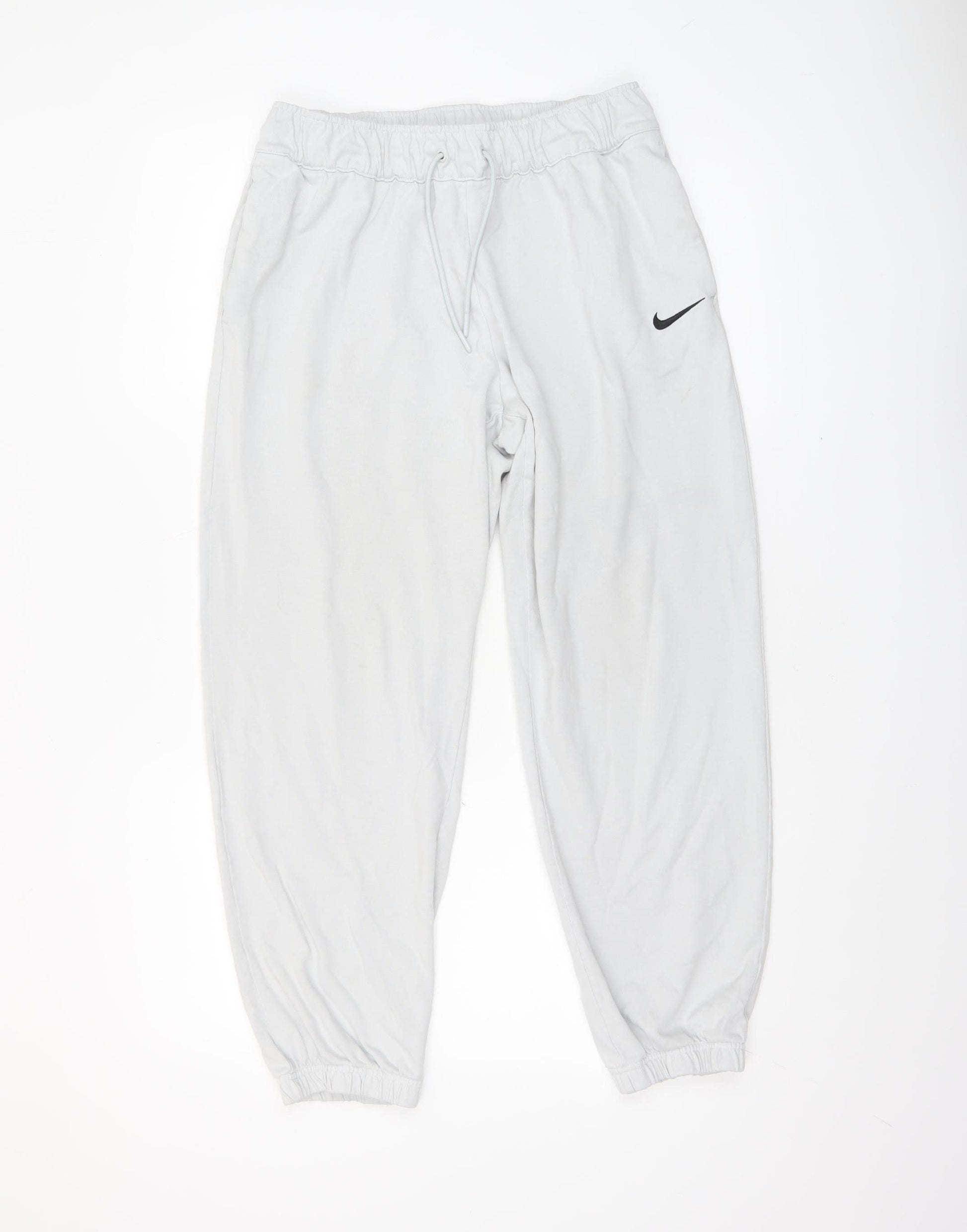 Step into all-day comfort with these Nike women’s grey jogger sweatpants, a versatile wardrobe essential designed to suit both active and relaxed lifestyles. Crafted from 100% cotton, these trousers deliver a soft and breathable feel that keeps you comfortable whether you’re running errands, lounging at home, or heading to the gym. The medium size offers a regular fit with a flattering taper through the leg, creating an effortless silhouette that complements a range of body shapes. Practical details include an elasticated waistband with a functional drawstring for a custom fit, along with handy side pockets ideal for keeping small essentials close by. The joggers also feature elasticated cuffs, keeping them neatly in place at the ankle for a clean and sporty look. Finished in a versatile light grey shade and accented with the iconic Nike logo, this pair balances understated style with everyday practicality. These sweatpants are perfectly suited for casual outings, travel, or relaxed workwear, blending comfort and timeless athletic appeal. The lightweight jersey cotton fabric adds breathability while maintaining durability and shape wash after wash. Pair them effortlessly with a cropped hoodie, t-shirt, or sweatshirt for an authentic athleisure aesthetic that never goes out of fashion. Ideal for autumn, spring, and cooler winter days, these Nike joggers are made to keep you cosy without compromising on style. In excellent pre-owned condition with no visible flaws, they represent an outstanding balance of quality and value. Enjoy the premium comfort, minimalist design, and trusted Nike craftsmanship that redefines everyday wear. Perfect for those who appreciate activewear that transitions seamlessly between lounging and lifestyle, these classic grey trousers make a smart, functional addition to your wardrobe.